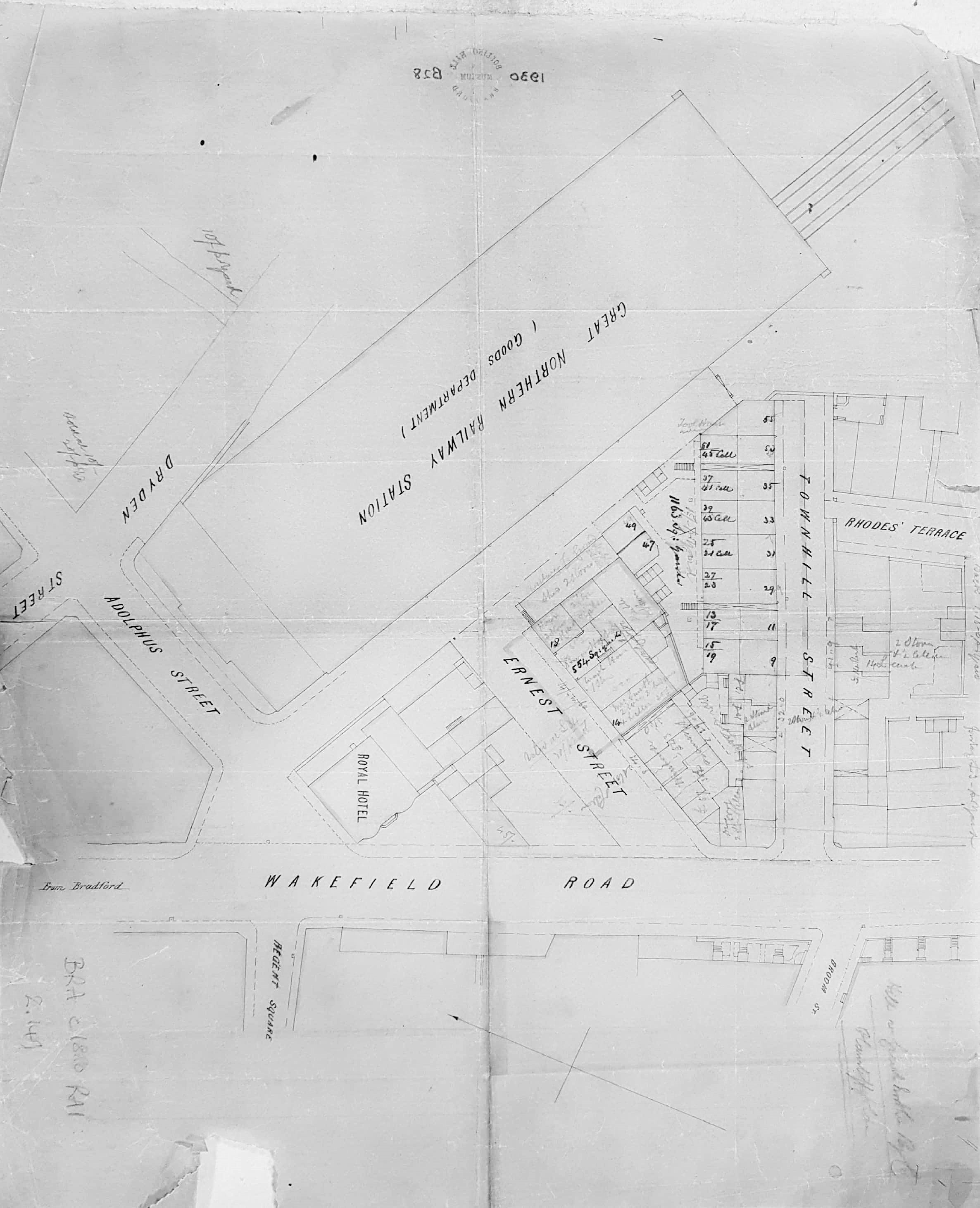 This item is annotated in pencil, ‘Hill v Great Northern Railway Co, plaintiff plan’. The land at issue is in a triangle between Wakefield Road, Townhill Street and Adolphus Street Station (GNR). Ernest Street and the Royal Hotel also also mapped. Adolphus Street station was originally opened in 1854 but this plan must date after 1867 (when Adolphus Street was closed to passengers) but before the 1908 OS map. I haven’t been able to identify this legal case but the most plausible scenario is that Hill is a landowner seeking compensation from the railway company. Comparison with other maps suggests that very little of the land involved was actually used by the Railway Company. There were several establishments in Bradford called ‘The Royal Hotel’. A famous one in Darley Street is now an Oxfam Shop (2018).