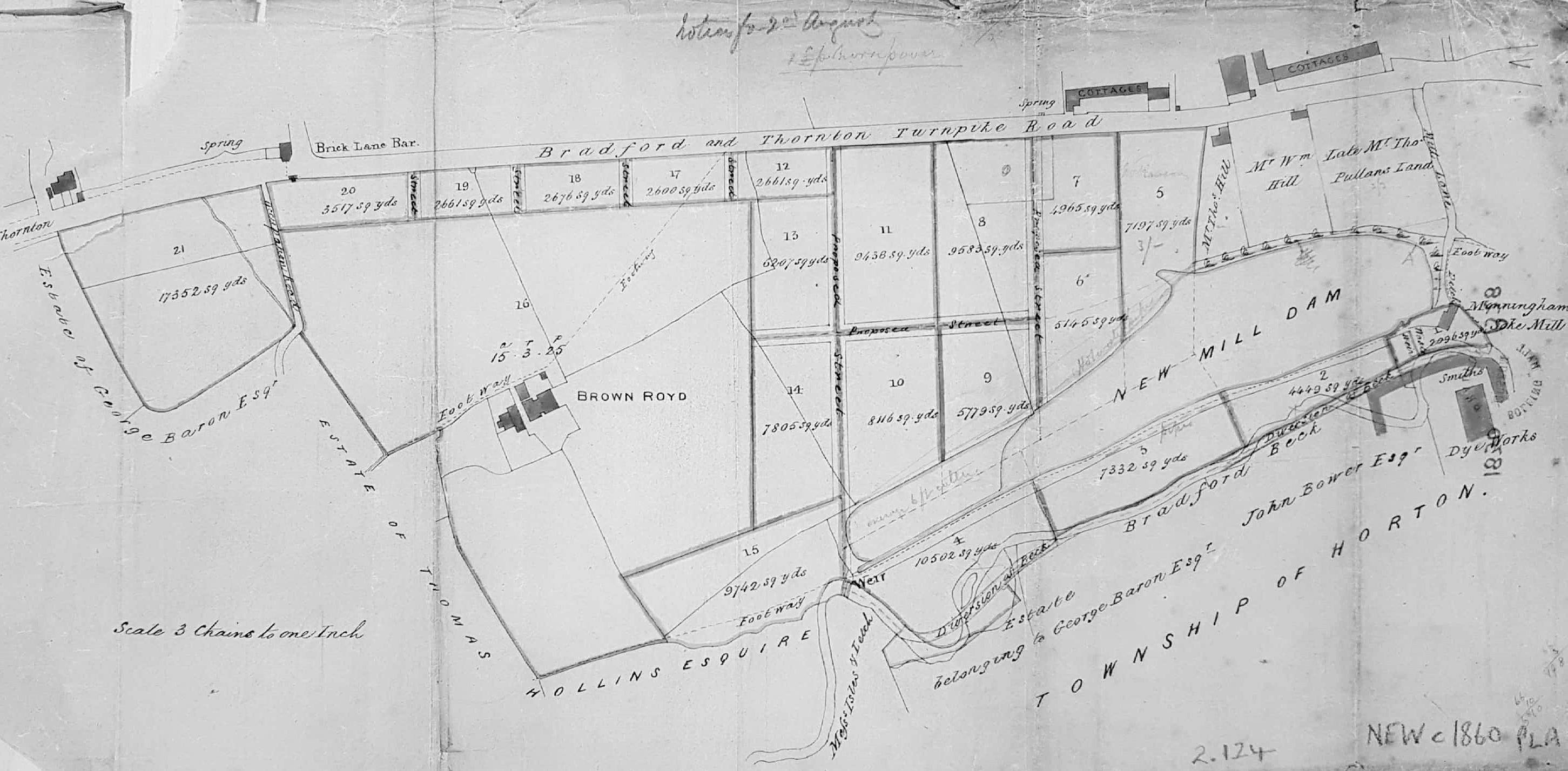 The map is undated. There are pencil annotations which are unhelpful. The overall distribution of buildings and field boundaries resembles the 1851 OS map including a Bradford Beck diversion which could have formed part of this scheme. Smiths Dye Works is a prominent building at the bottom right. In the OS map a dye-works of a somewhat different foot print is called Field Dye Works but we are looking at the same enterprise namely: Samuel Smith, stuff dyer, who in an 1850 trade directory was at Field Dyehouse, Thornton Road. A fire occurred at Smiths Dye Works in March 1848 (Bradford Observer) which could have accounted for some rebuilding. I have dated the plan as c1850. Cudworth records that the New Mill(er) Dam was created by John Smyth of Heath, near Wakefield, around 1777. His family were associated with Miryshay, off Barkerend Road. George Baron of Clockhouse Estate is a land-owner included on the plan, and he died in 1854. Thomas Hollins is also mentioned who is probably the man who Cudworth reports lived at West House, Toller Lane and was a stuff manufacturer, or perhaps his son of the same name.