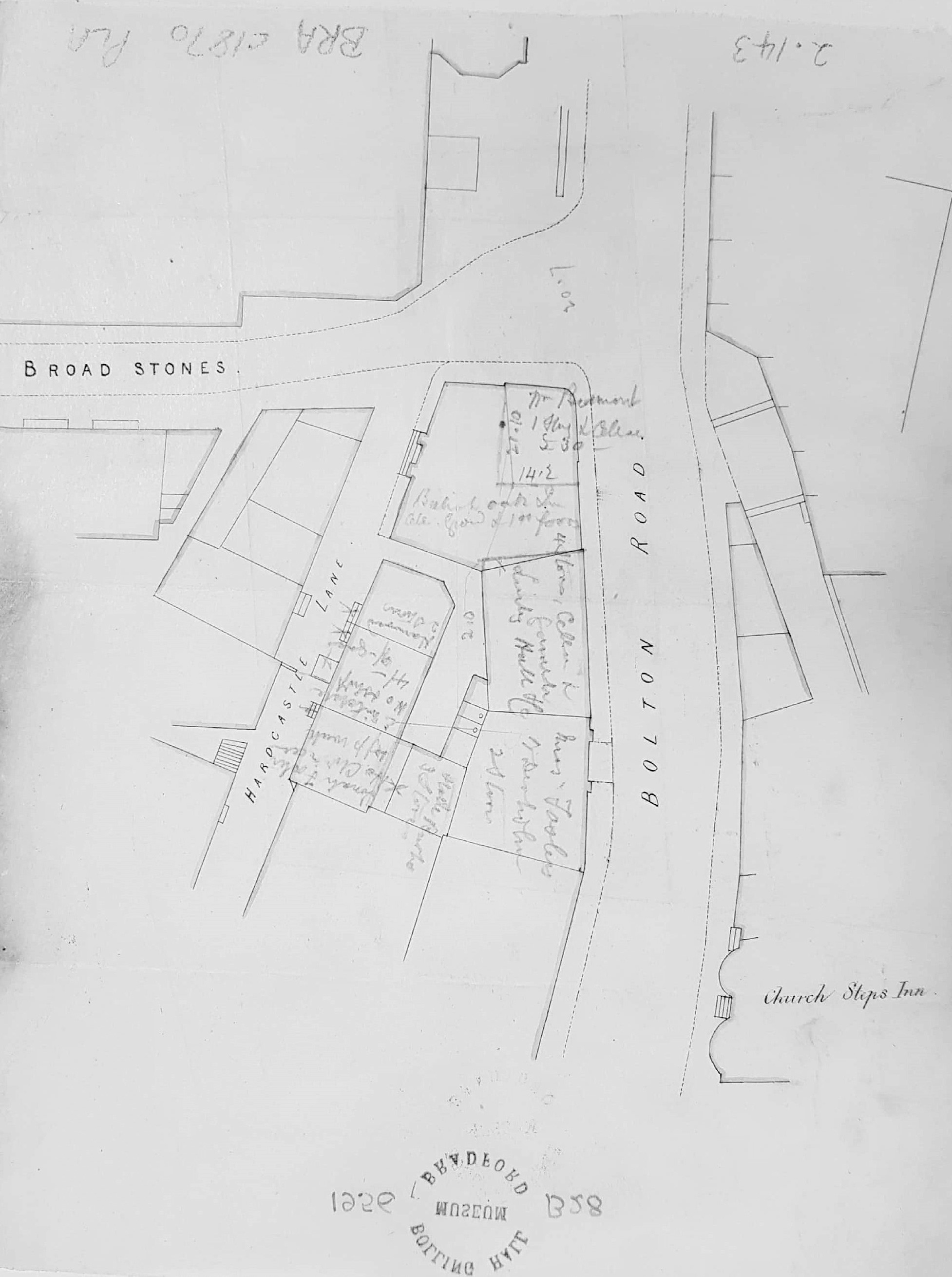 This is a property map, in fine ink lines, of the Broad Stones, Bolton Road junction near the city centre. The plan has the property owners, or at least occupiers, added (not very legibly) in pencil. Of some help in dating is the Church Steps Inn, which I believe was demolished prior to the construction of Forster Square Post Office. William Scruton (whose book contains a drawing of Broadstones) says that the inn was swept away in 1882. Some building seems to have taken place since the first OS map so our plan would appear to date from 1852-82. The junction of Broadstones, Hardcastle Lane and Bolton Road is the situation of an business which (in pencil) seems to be the British Oak Inn, but I’ve totally failed to find this in trade directories. Of the other occupiers Jonah Foster, E Mitchell, Burke, & Harwood (2 stories) the only one I’m reasonably sure of is Greenwood Harwood, a whitesmith at 12 Hardcastle Lane in the 1861 Bradford Directory. On this rather tentative basis I’m dating the map as c.1861.