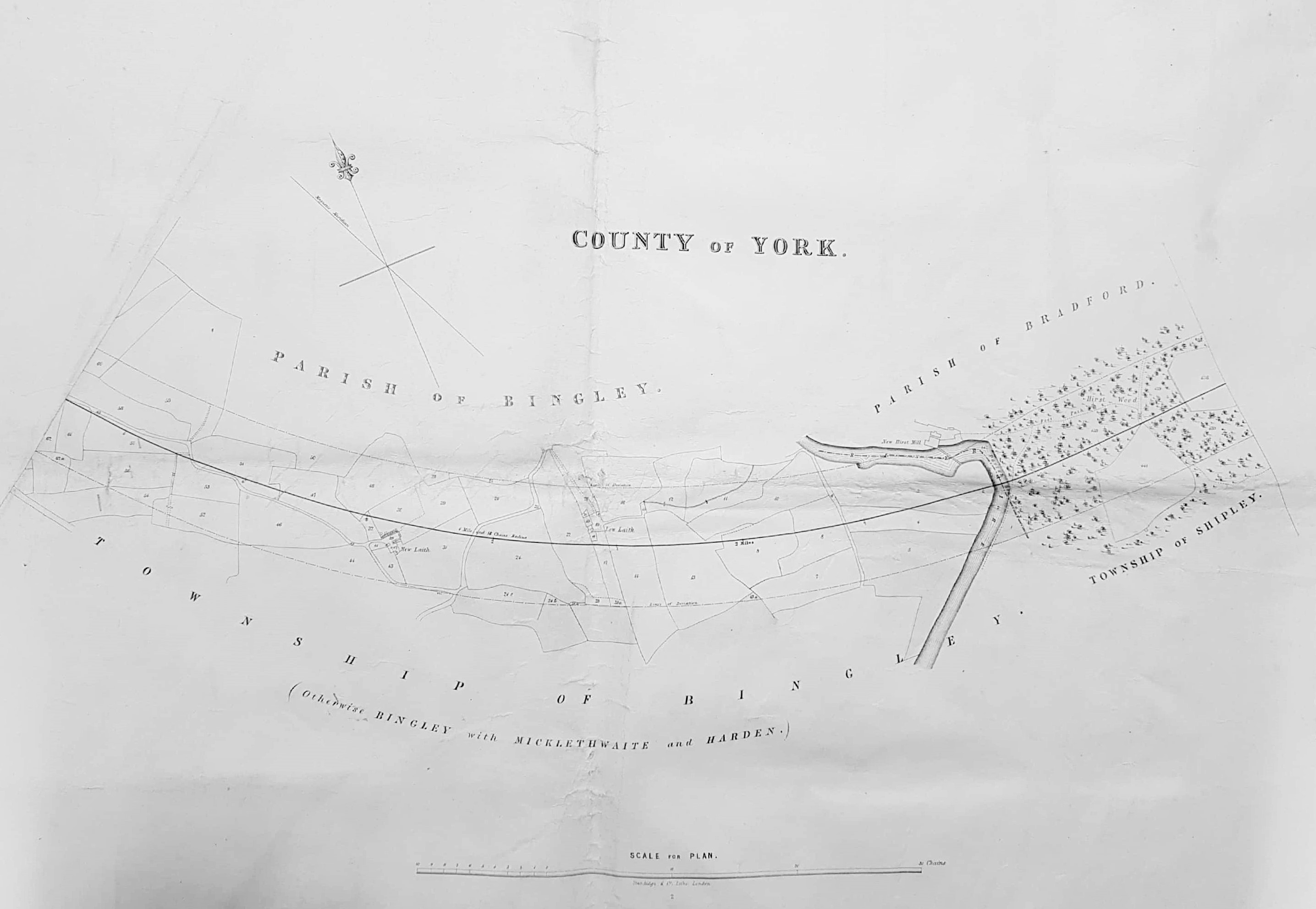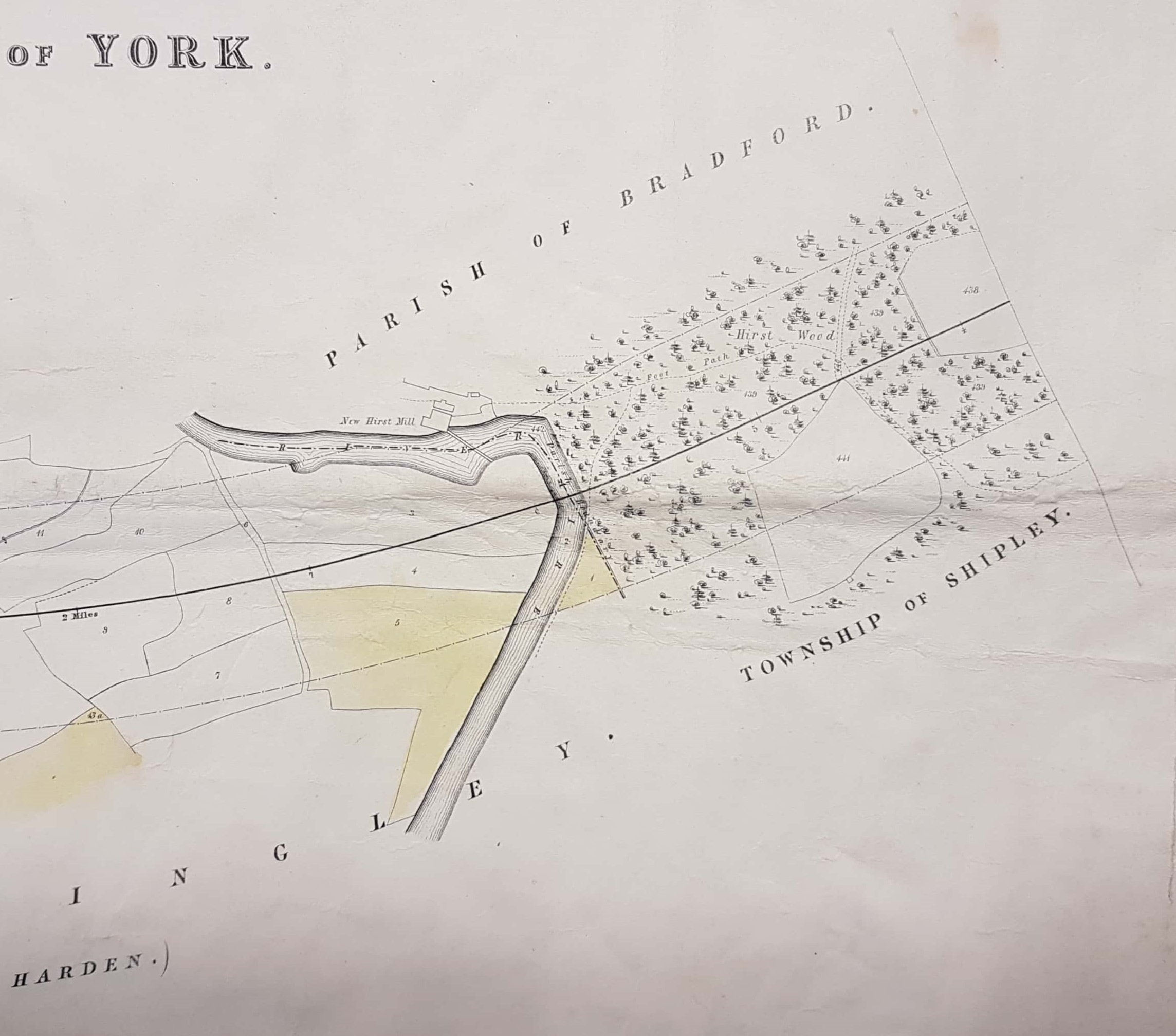This plan show the proposed course of the Leeds & Bradford Railway between Shipley and Bingley (the Shipley-Colne line). It is one of a series of such plans. The line opened in 1847 and I have derived the presumed date from this fact. The relationship of the line to the River Aire, New Hirst Mill and New Laith is clearly shown. The nearby canal to the north-east is not mapped. An interesting feature are the buildings and weir belonging to New Hirst Mill, and the trackways through the adjacent portion of Hirst Wood which at this time was part of the Rosse estate.