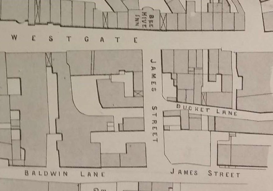 ‘Cross Street’ in the second plan has been considered as part of James Street, and must have been as incorporated into Godwin Street when this thoroughfare was developed in the early 1870s. Please note the street called Baldwin Lane which will feature in later discussion. The 1861 White’s Directory of Bradford does not contain Duckett Lane but includes James Street. Unfortunately no places of entertainment are listed here although an Ezra Hoyle is a beer-seller in ‘Cross James Street’. Hoyle is still there in the 1863 Directory. In the 1861 census his residence is described as the ‘Bay Horse Inn’.