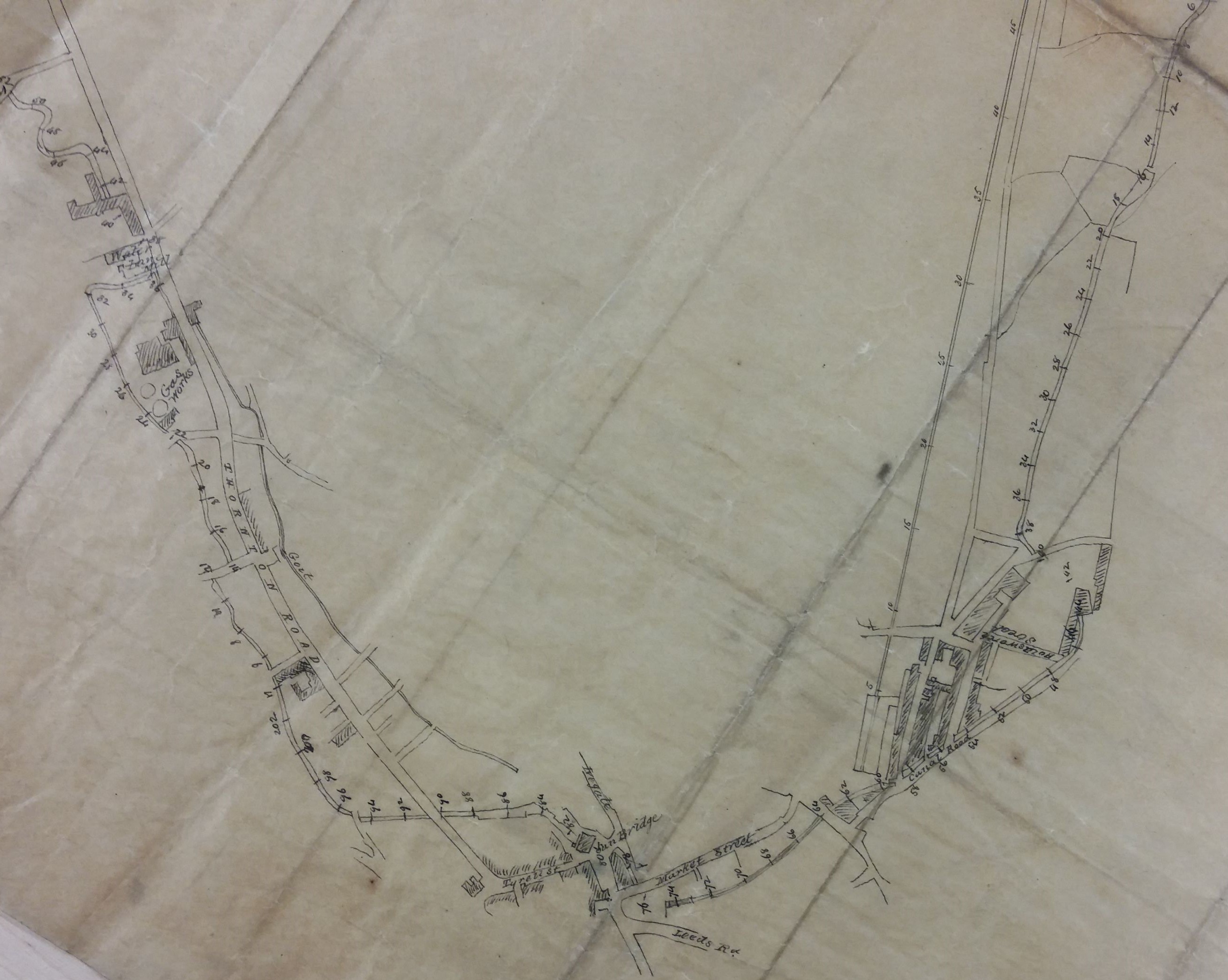 Today the Bradford Beck is almost completely culverted. This map plots the course of the waterway through the city in the mid-nineteenth century, indicating the significant points through which it passed. The relationships of the beck to Thornton Road and the Soke Mill goit are particularly well displayed.