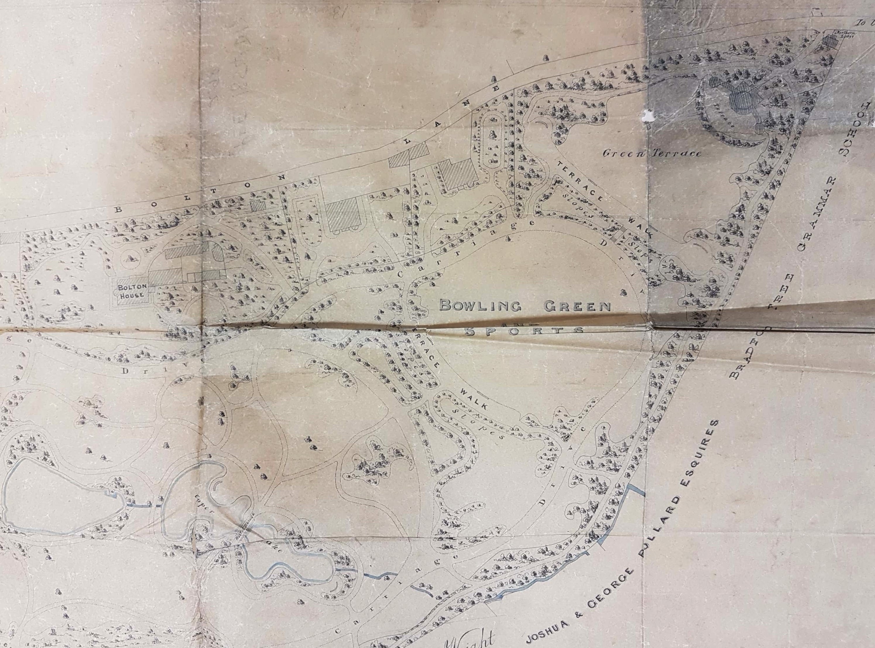 Peel Park is located in the Bolton and Undercliffe areas of the city. It is Grade II* listed, 56 acres in extent, and was named after Sir Robert Peel (1788-1850). It was opened to the public in 1853, so this plan may well have been the first one produced. The LSL reserve collection has a second example (10.003), also in poor condition, marked as a ‘collection duplicate’ and ‘Town Clerk’s copy’. Peel Park is significant since it was such an early example of a public park. Joseph Paxton’s design at Birkenhead is generally accepted as the first in England, being opened in 1847. The group that financed our park initially retained control and weren’t, for financial reasons, able to present it to the Borough of Bradford until 1863. We have a third plan (10.004) from 1884 which is a beautifully surveyed and drawn plan of part of the park and intended for local authority use. The first OS map of the area was released a year before Peel Park was opened but was based on a survey undertaken in the late 1840s. Its not hard to locate the position of the future public space. I have tried to establish who owned the land on which the park was constructed. Horace Hird has an account of its early days in his Bradford in History (1968, p.140-41): he describes land purchase of 47 acres from the trustees of lawyer Richard Tolson and also a 17 acre purchase from Richard Shaw. Having said all this I am not completely sure for what purpose the present map was produced. In 1854 the Bradford Observer explained that a lithographic plan was to be sold shortly showing the Park ‘as it will appear when is completed’. This is important since not all the features drawn seem to have, in reality, existed. Hird also explained that various unwanted properties, acquired with the estates, were sold off by the Organising Committee to raise money. One possibility is that this plan was intended to encourage builders and developers to take advantage of this new civic adornment, and its positive effect on property prices.