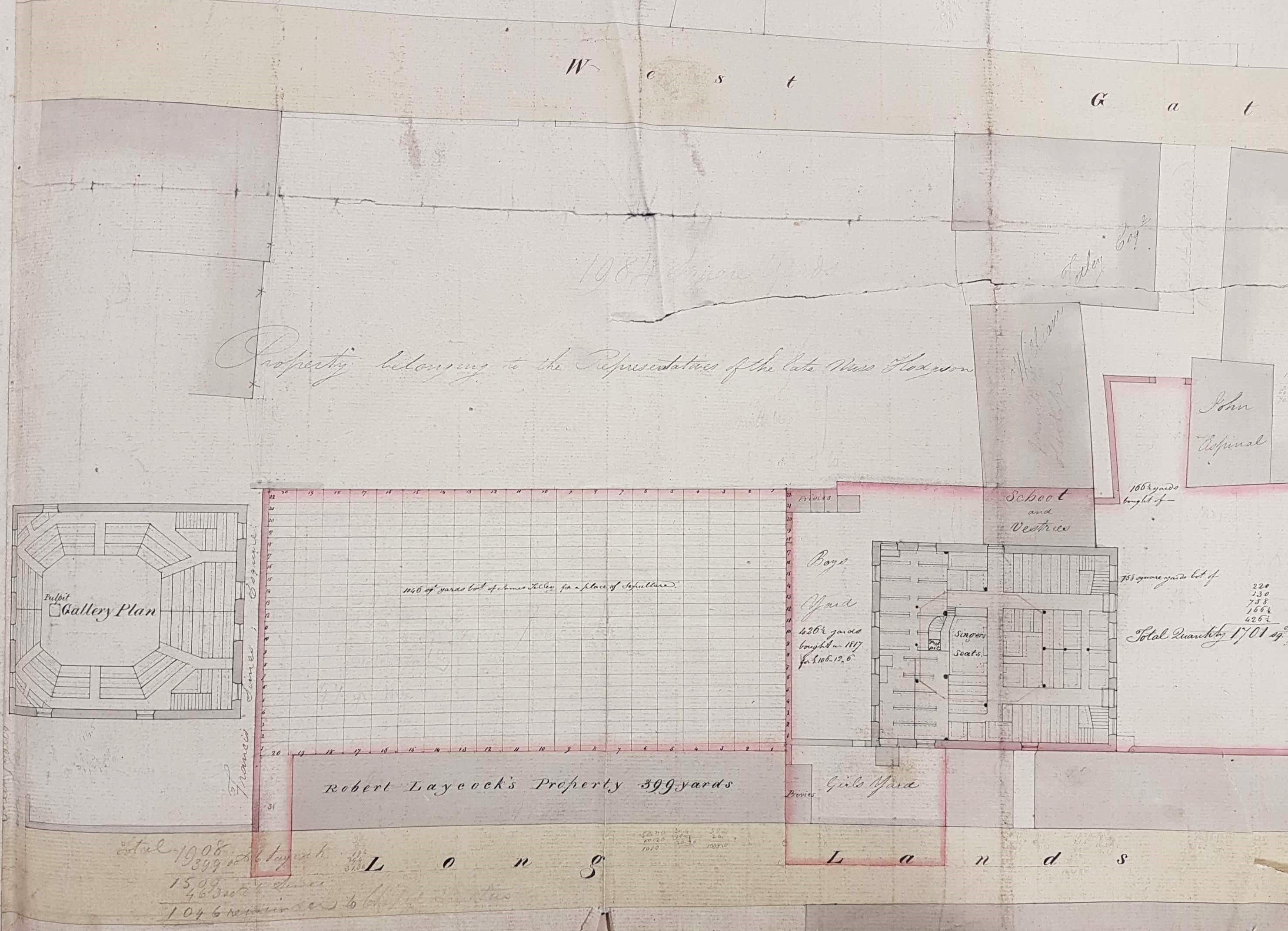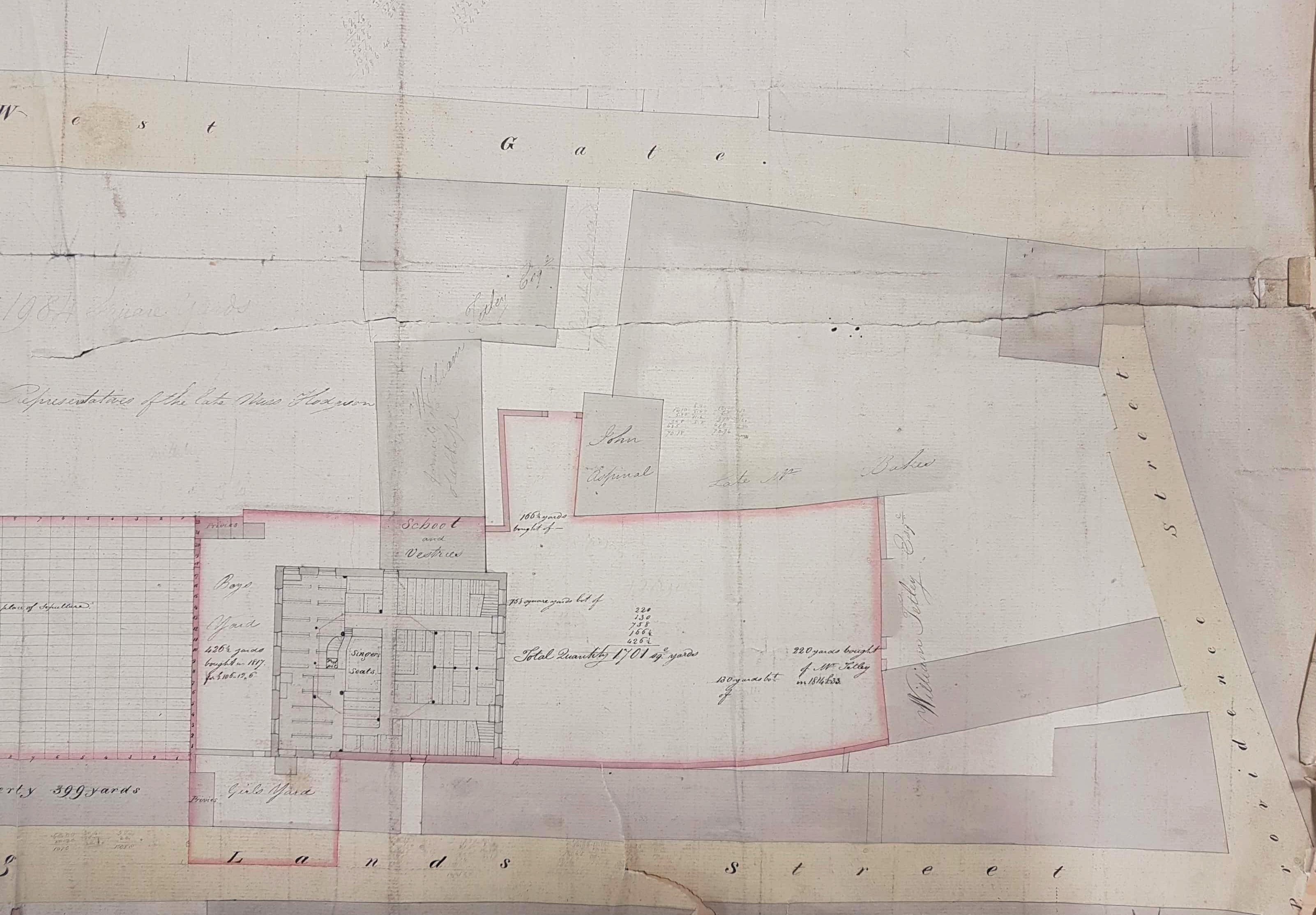 The Sunday or Sabbath School was clearly a flourishing institution. The Bradford Observer reported in June 1840 that it had 910 scholars, and had to be enlarged. The boys and girls had separate yards, and separate privies. Many of the adjacent land-owners are named: Robert Laycock, Francis Simes Esq., the late Miss Hodgson, William Tetley, John Aspinal and the late Mr Baker. The original site must subsequently have been enlarged since it is recorded on the plan itself that ‘220 (square) yards were bought of Mr Tetley in 1814 for £33’.