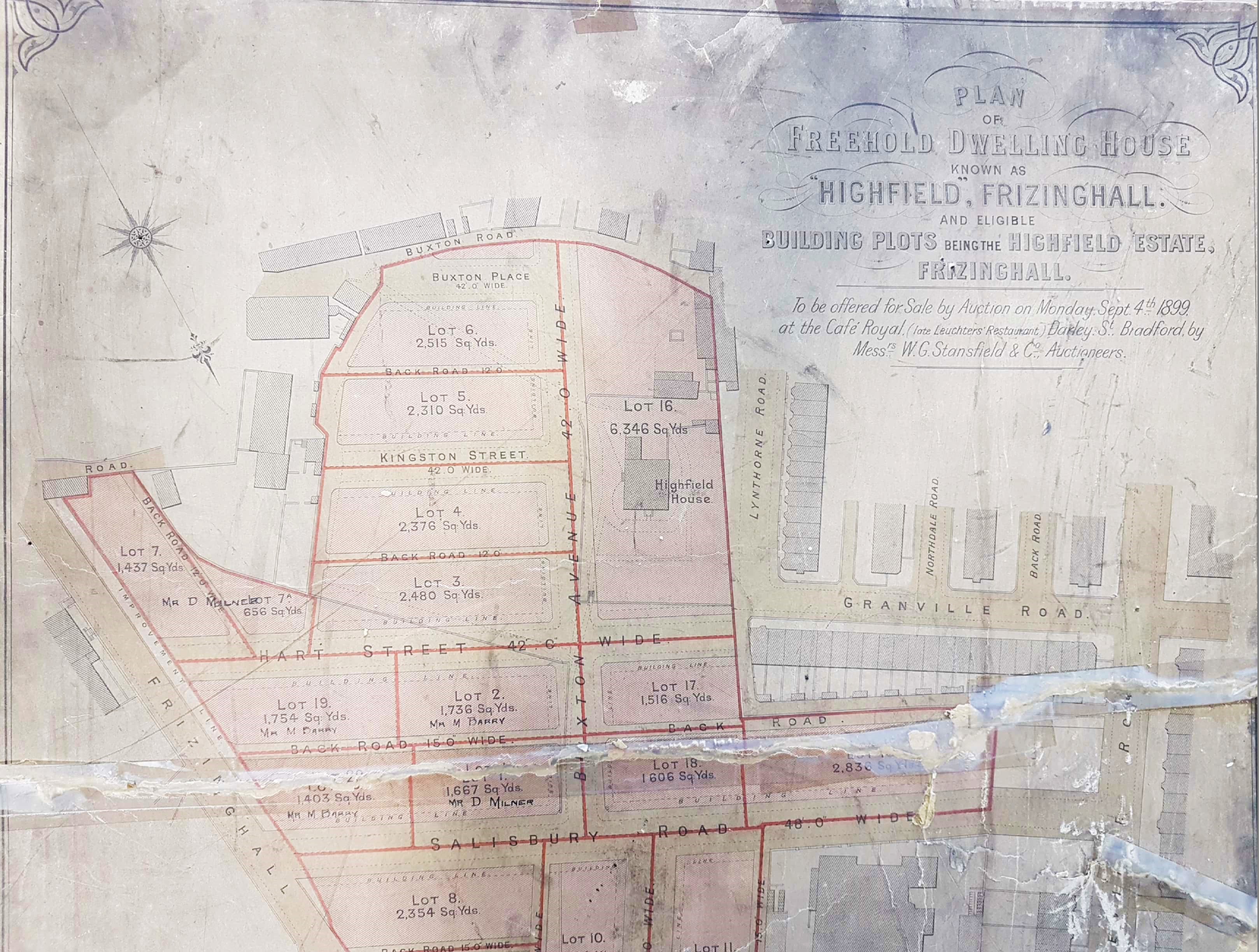 This is a plan which evidently once accompanied a land sale catalogue for an area between Aireville Road and Frizinghall Road. An estate attached to Highfield House, Frizinghall was being sold for building development. I don’t know a great deal about Highfield House. For 20 years (censuses 1871-91) the residents were James Hargreaves Wood and his wife Hannah, with various children and servants. James H Wood is recorded as being a farmer of 25 acres which plausibly is the estate that was later being offered. He was the son of Joseph Wood and Sarah Hargreaves; Joseph Wood and his sons were well-known as the proprietors of Dumb Mill, Frizinghall. John Hargreaves Wood was well to do for a farmer, leaving an estate of nearly £10,000 when he died in August 1891. Possibly it was his death that ultimately triggered the land sale, or more probably the death of his eldest son, John Wood, in 1898.