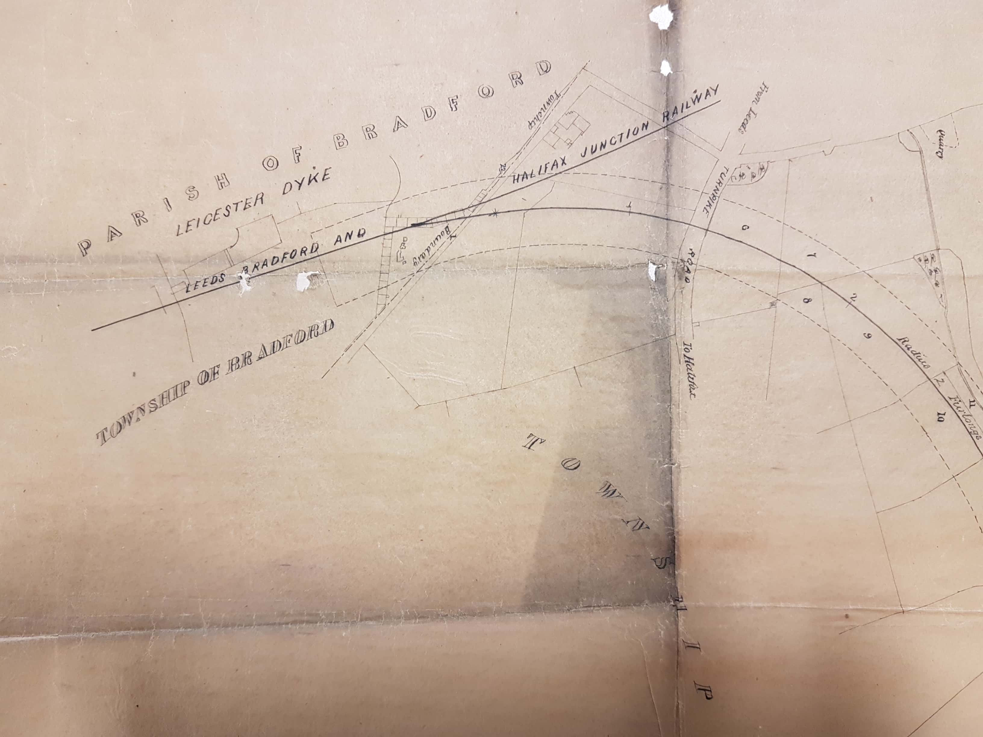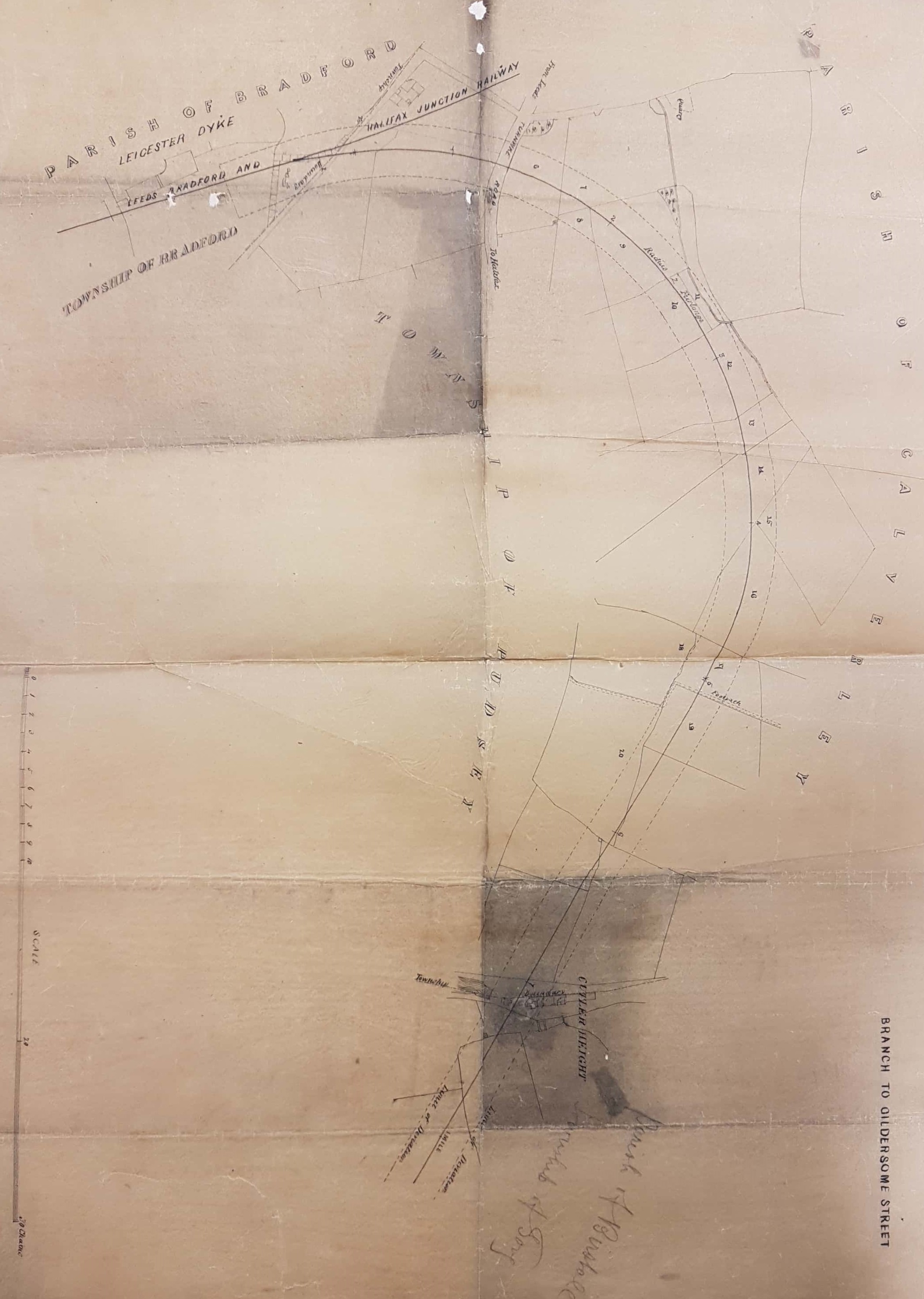 Since this plan was first published I have located a second in the Local Studies Library reserve collection which shows Laisterdyke (spelled Leicester Dyke) station mapped on the Leeds, Bradford & Halifax Junction railway (later GNR Bradford – Wakefield). This plan must be later than 1854 but I don’t have an exact date. The maps shows the land required for the Pudsey Loop (opened 1857) which was part of the line to Dudley Hill and then on to Gildersome Street, Morley, and Ardsley.