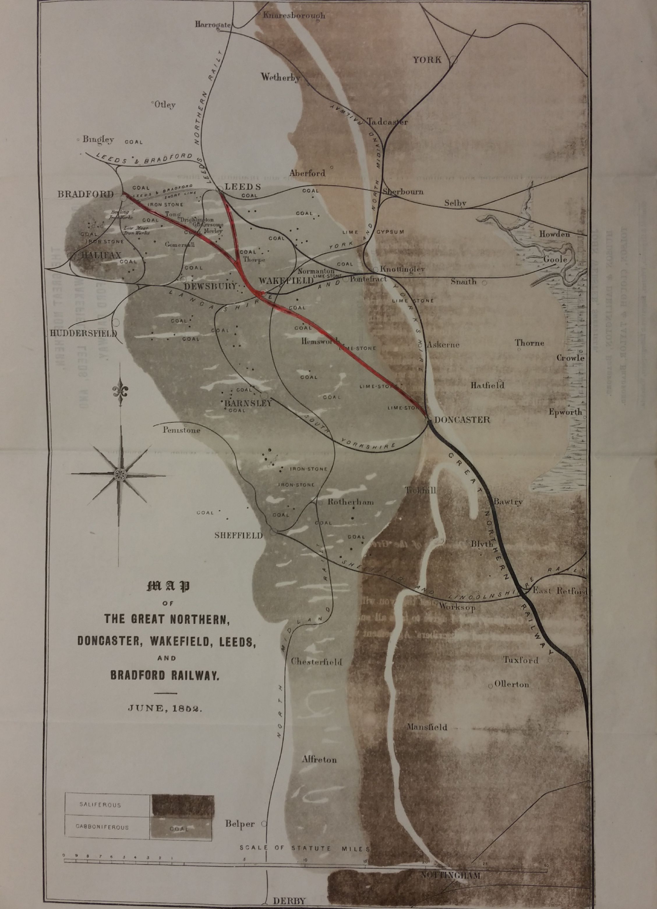 What we have here is evidently a map which once accompanied a company prospectus. A more complete account of the company can be found in the Bradford Observer 21 1852. It was called the Great Northern, Doncaster, Wakefield, Leeds & Bradford Railway and its list of provisional directors included among its number textile barons (Titus Salt and Samuel Cunliffe Lister) and present and past Bradford mayors (Samuel Smith and Robert Milligan). The directors had raised, of were seeking to raise, a very substantial capital. They had appointed as consulting engineer Sir William Cubitt (1785-1861) who was familiar with bridges, docks, canals and railways and was the chief engineer for the Crystal Palace (1851). Joseph Cubitt (1811–1872), who is also mentioned, was his son and a civil engineer.