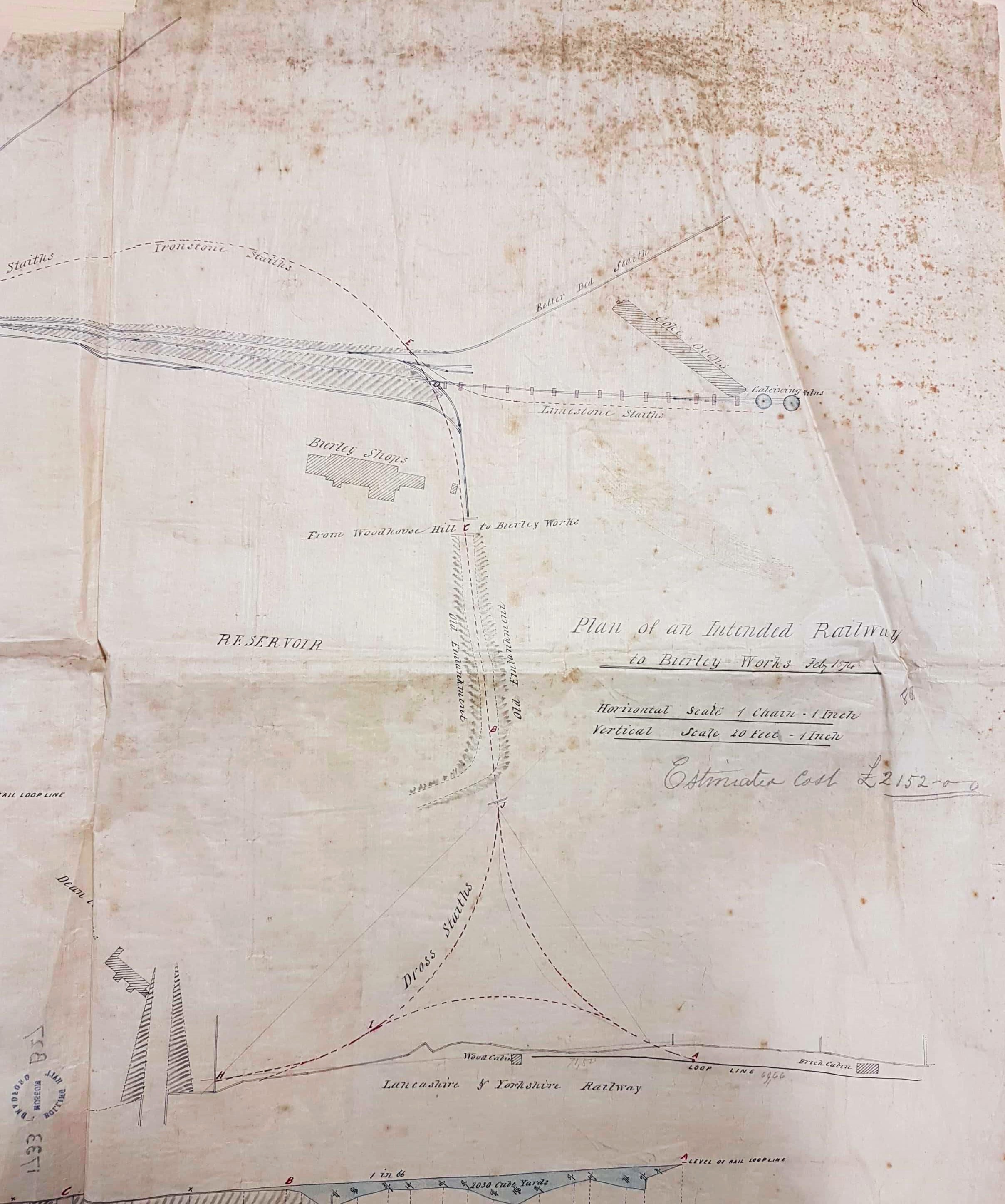 This plan, with west at the top, records an intention to construct a loop line from the Lancashire & Yorkshire Railway, Bradford-Halifax mainline, to service a portion of the Bierley Ironworks, at an estimated cost of £2152. This would pass through an old embankment and round a reservoir. The area involved is immediately east of Wesley Place and the L&YR track involved is just south of Bowling tunnel. An earlier, but anonymous, student of the plan has provided us with a date of 1874 which I have no reason to doubt. The new track arrangements were certainly in place by the time of the 1889 Ordnance Survey 6 inch map. Low Moor Iron Company was founded in 1790. In 1854 it acquired the Bierley Ironworks which until then had enjoyed an independent existence. The new acquisition was integrated with the Low Moor works and stayed in operation for the remainder of the nineteenth century.