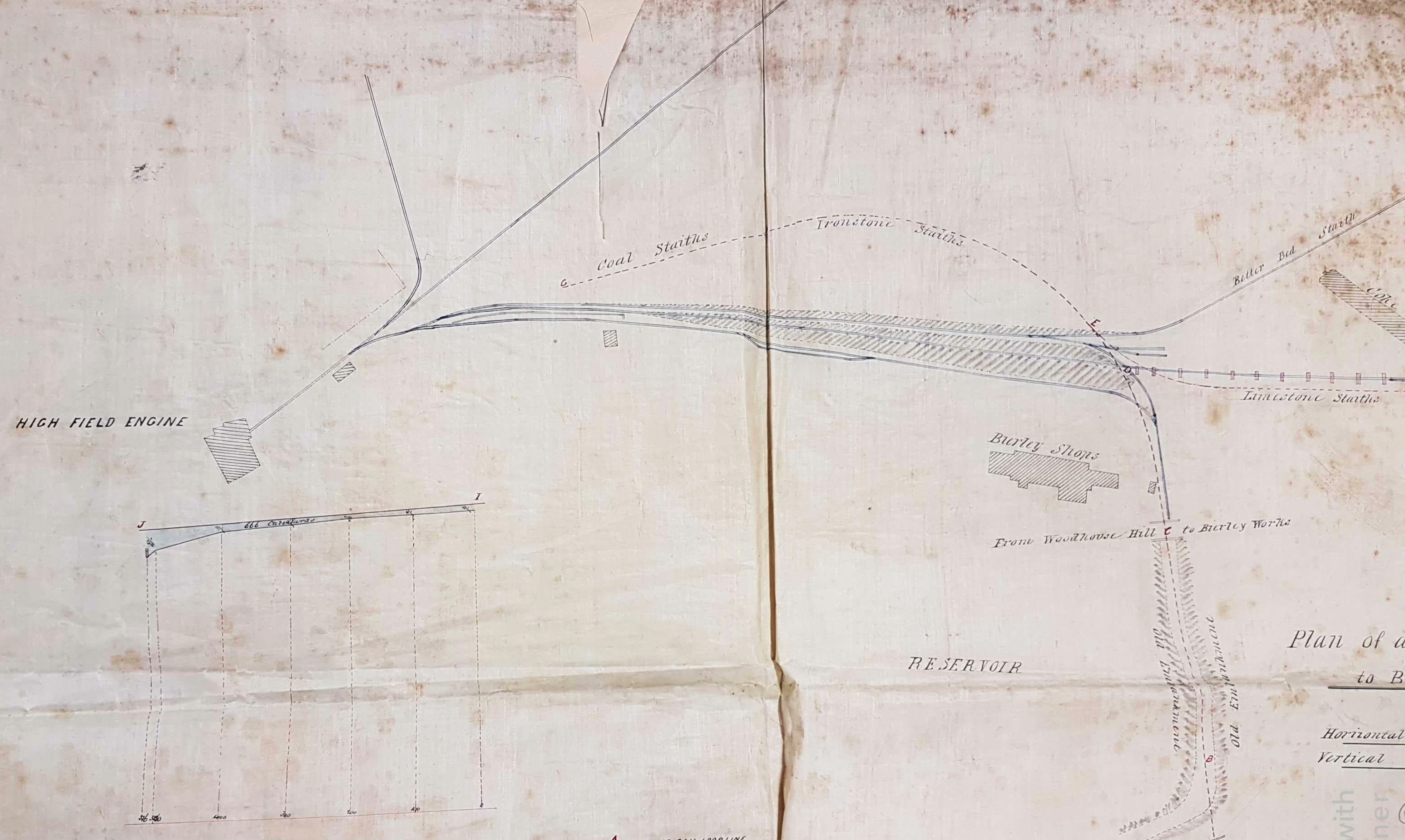 The value of this plan lies in the works details recorded: ironstone staithes, coal staithes, Better Bed staithe near to the coke ovens, limestone staithes, and dross staiths. Staithe is a dialect word meaning a storage area or a landing stage for loading or unloading cargo. The fact that the word is found in Yorkshire, Northumberland and Norfolk suggests a Norse origin. In any event these plan details, if properly understood, explain the whole operation of iron smelting blast furnaces in Bradford. A commercially valuable seam of ironstone or iron ore was found in the roof of the Black Bed coal seam which was exploited over much of Bradford and sites on its southern boundaries. A number of blast furnaces were constructed to smelt the ore, the most famous being those of the Bowling Iron and Low Moor Iron Companies. A huge network of mineral tramways were set up by both companies to collect the outputs of the mines they operated. The continuous lines emerging from the High Field Engine on the present plan are examples of such tramways.