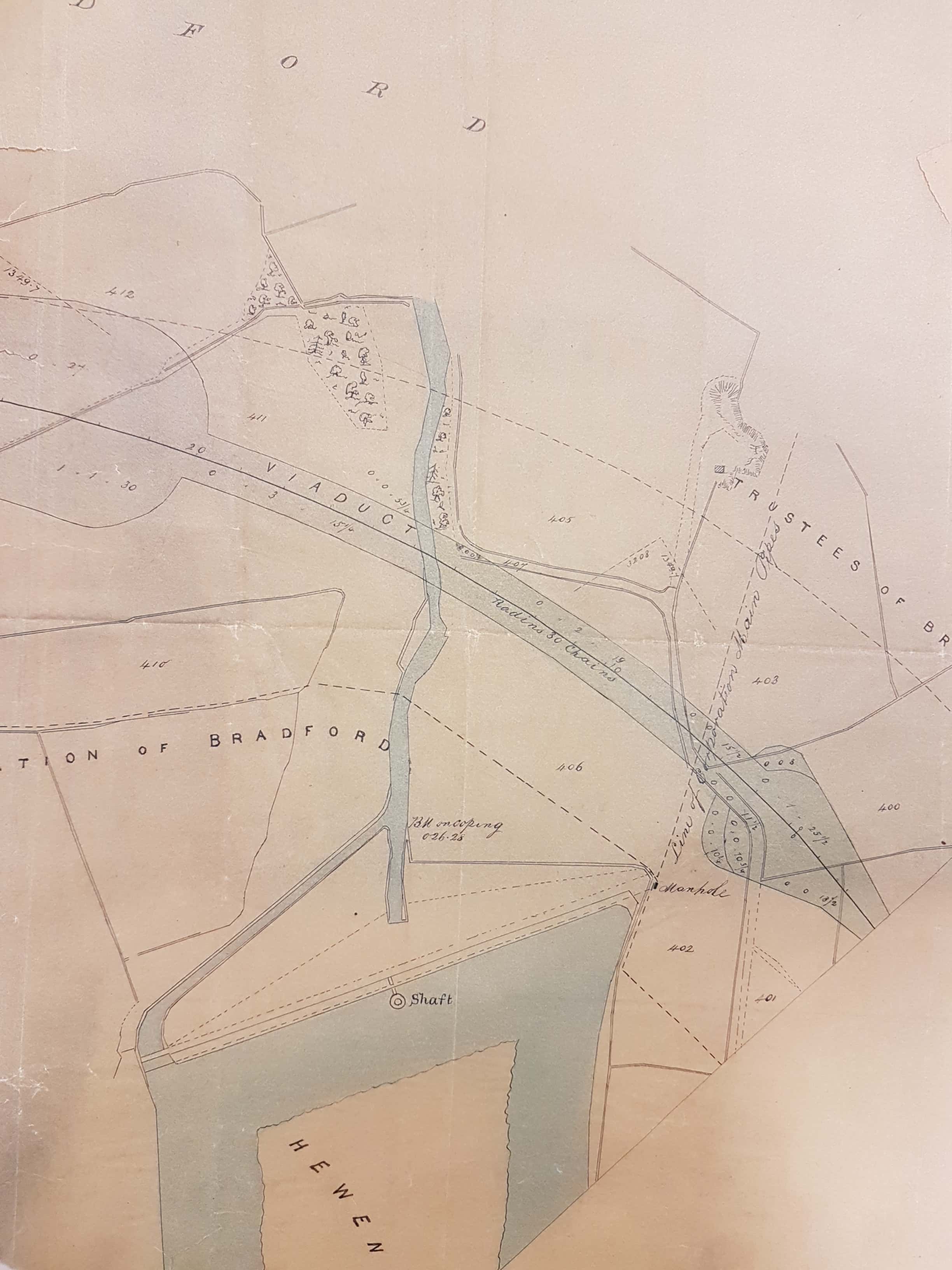Some of the plans in the LSL reserve collection are in very poor condition indeed; they would require a skilled paper conservator to restore them to life. This is particular true of those drawn on a tan coloured 19th century tracing-paper which the passage of 150 years has made rather brittle. For many a photograph of a detail, together with a general description, will have to suffice. This is the case with the present plan showing the relationship between Hewenden reservoir and viaduct, near Cullingworth.