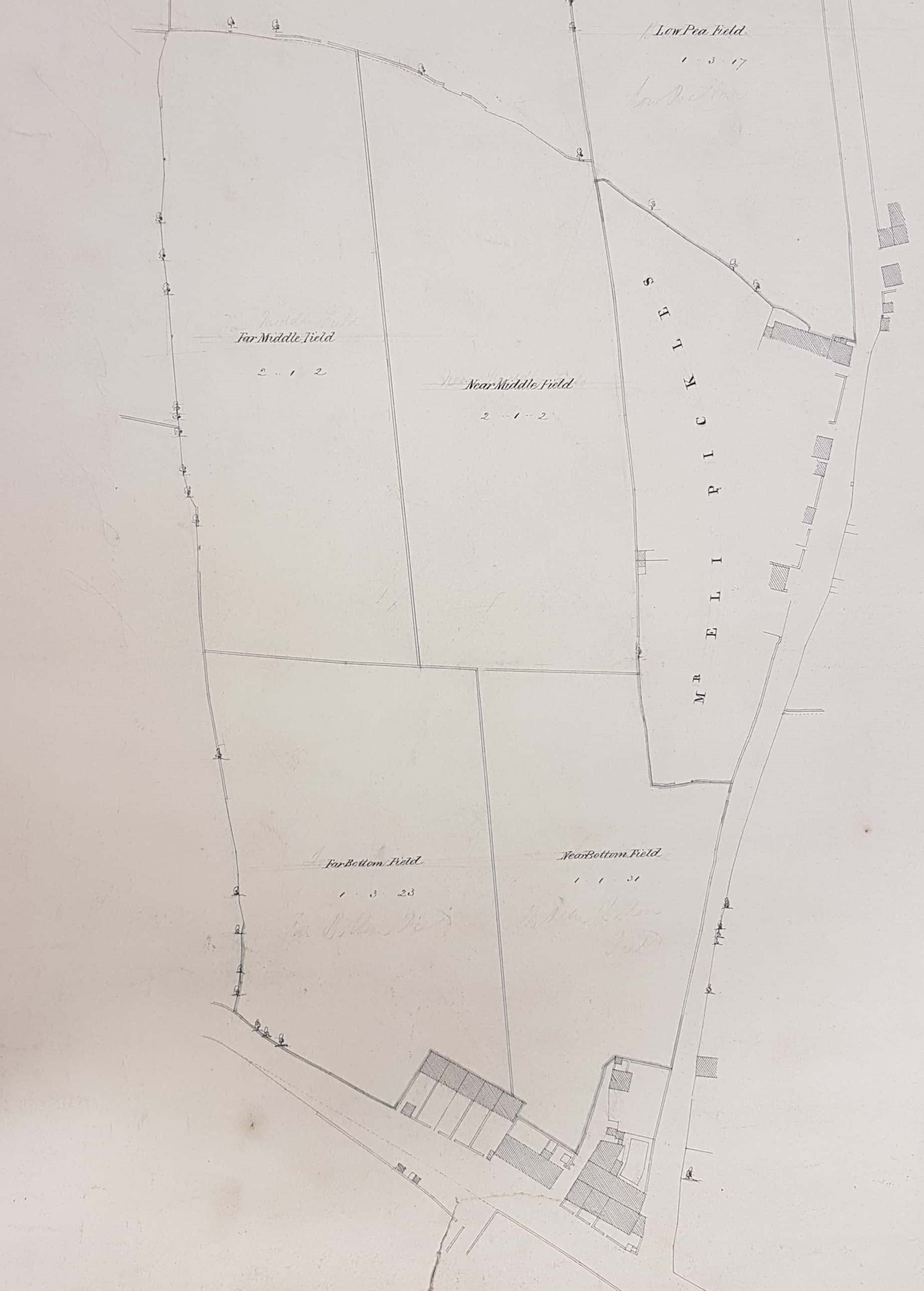 On this plan the fields names are given and the boundary pattern is identical to the OS map, which I have used for confirmatory dating purposes. These rectangular field shapes are typical of enclosed land resulting from the various late eighteenth and early nineteenth century Enclosure Acts. The field names themselves are fairly pedestrian: Far Bottom and Near Bottom and so forth. Low and High Pea Fields suggest a crop, and indeed nearby Heaton was famous for its peas, according to its historian Stanley King. The roughly diagonal line running across the centre of the plan, with little formalised trees growing along it, is probably an unnamed watercourse. The plan seems to be quite accurate but the overall rustic impression it gives now is quite misleading. In the real world the bottom right-hand corner was occupied by Four Lane Ends Colliery in the middle of a cluster of ‘old pits’. At the top right corner was a sandstone quarry. In many ways the immediate area looks more rural in the second OS map of 1889 as signs of these extractive industries have vanished. At the time of our plan the only scholars would have been at the Baptist Lady Royds School in the lower hamlet but which is not identified on the plan. This was seemingly a Sunday School erected in 1827. Clearly Mr Eli Pickles is mentioned as a separate landowner. A man of this name was a quarry and delph owner in Bolton and it is his name which unlocks the purpose of the whole plan.