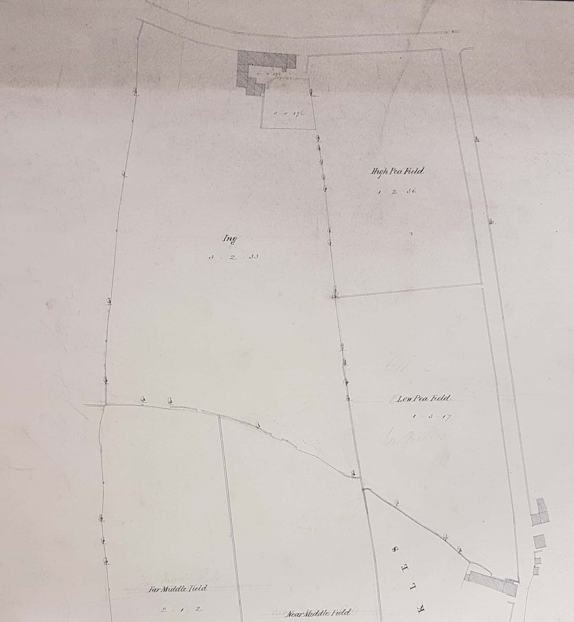 This plan is undated and untitled. Most helpfully on the back it is annotated ‘A148 Lady Royd Farm, Manningham’. To improve visibility I have split it in half and the first image is the bottom and the second the top or the original. As well as Indian ink lines and lettering there are also pencil construction lines which are faint and may not be visible in this image. I would imagine that these were normally erased in the ‘final correct’ version of such a plan. The name Lady Royd or Rode is a very ancient one, and the two sets of dwellings marked on the two images were probably called Upper and Lower Lady Royds.