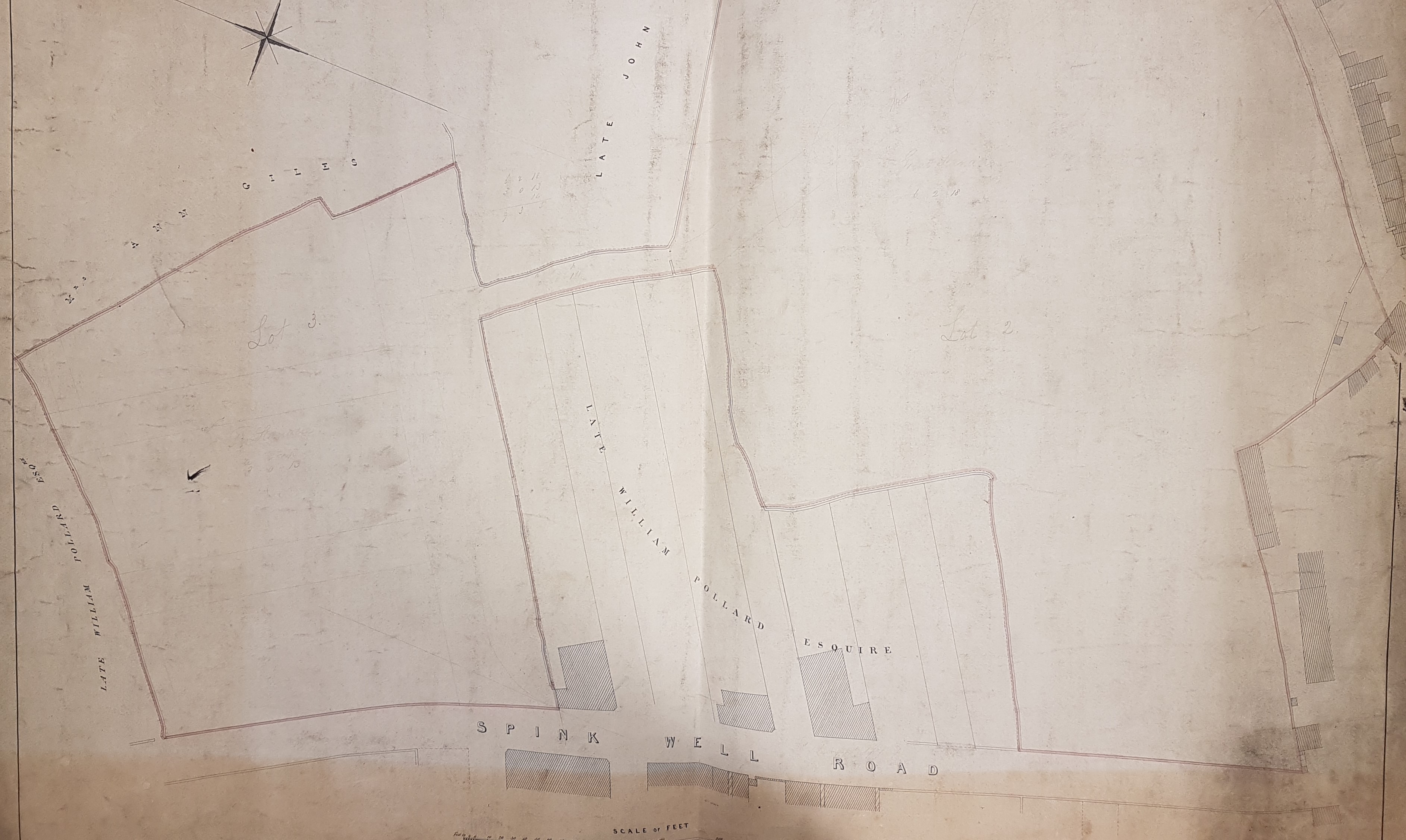The two field boundaries connected by a ‘corridor’ fits the first OS map, c1850, but within 20 years the area was to be the site of a brick works. Aside from Mr Shaw three other land-owners’ names are included: Mrs Ann Giles, the late John Hustler Esq., and the late William Pollard.