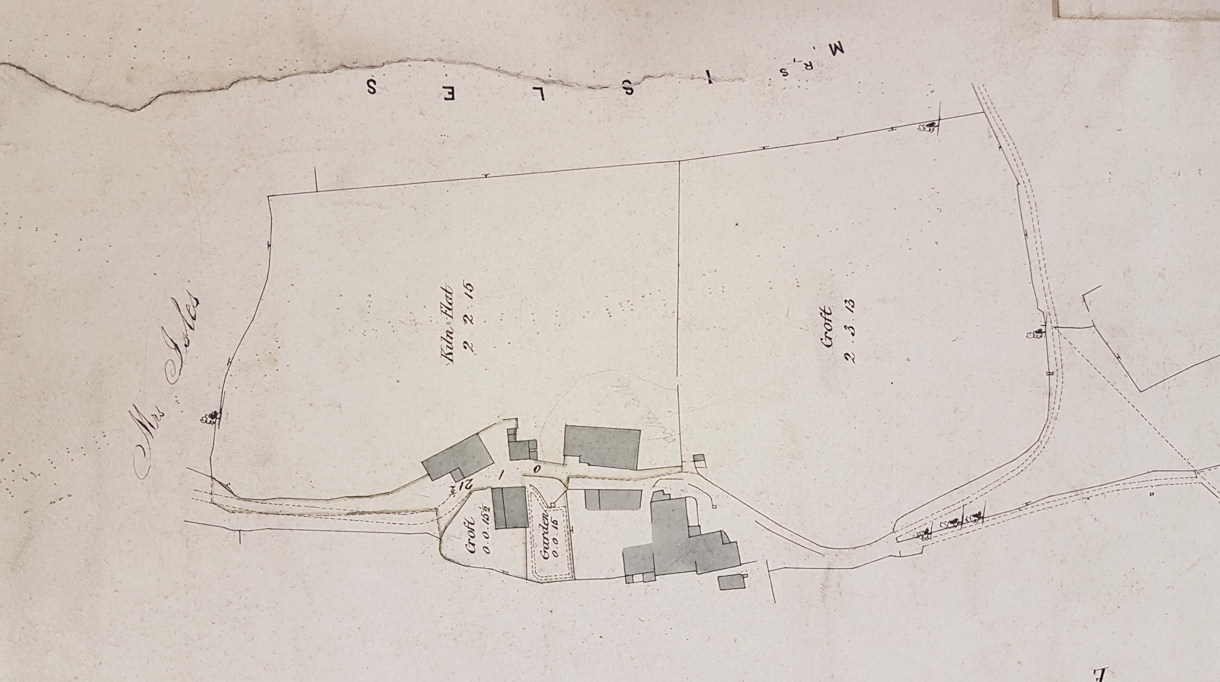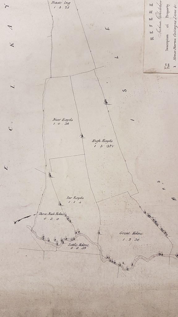On the plan, among the farm buildings, a croft and a garden are noted. The adjacent field is named as Kiln Flat. Other fields with names including the elements Ing, Royds and Holme stretch almost due south down to the Pitty Beck. The overall topography had not changed much by the early twentieth century and is perfectly recognisable from aerial images from ‘Google Earth’ as recently as 2011. Subsequent to that the buildings are present but the turf has been stripped off Kiln Flat and Croft fields for some purpose. Today the turf is restored and the pattern of boundaries, recognisable from the plan, remains substantially intact.