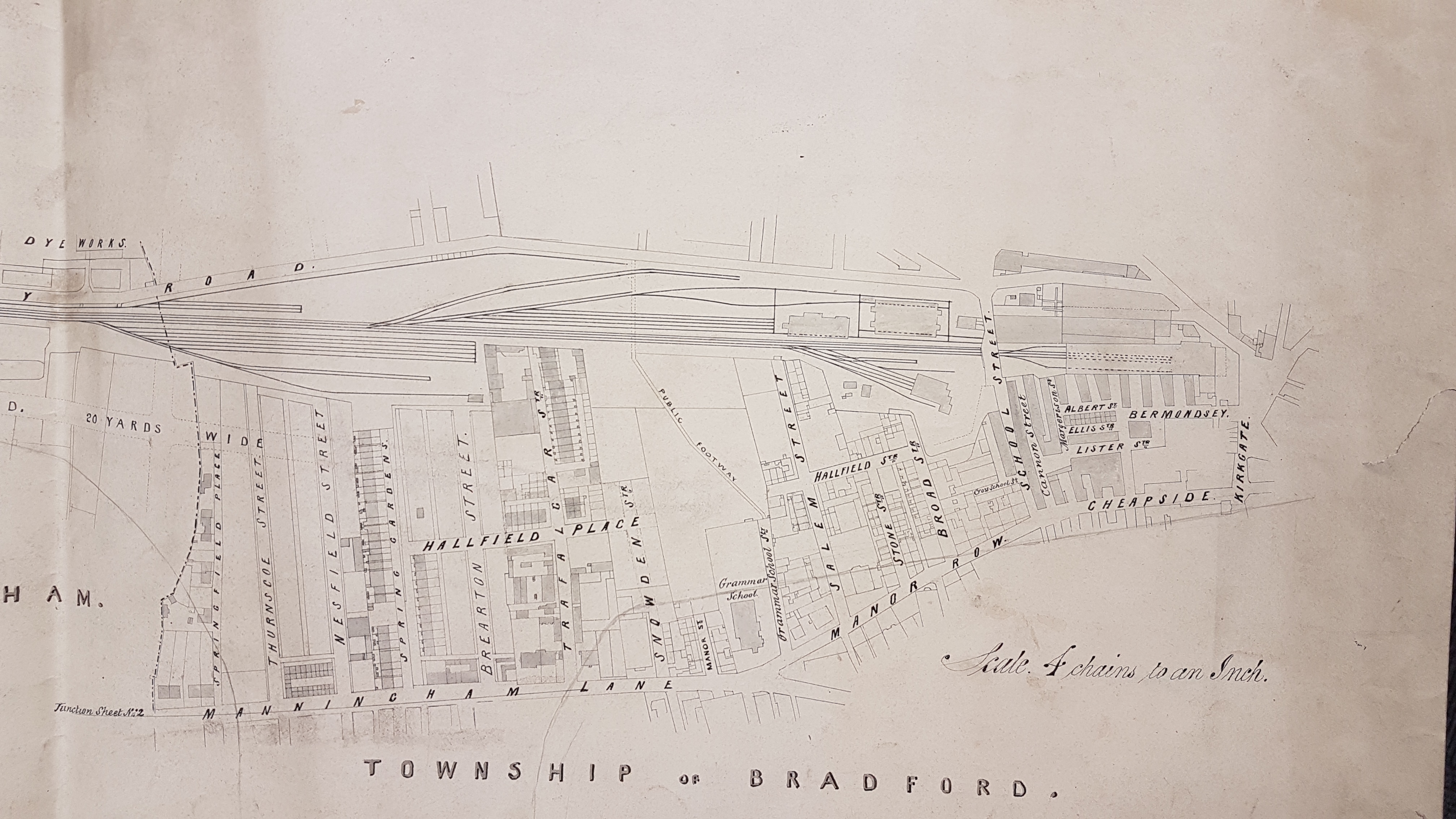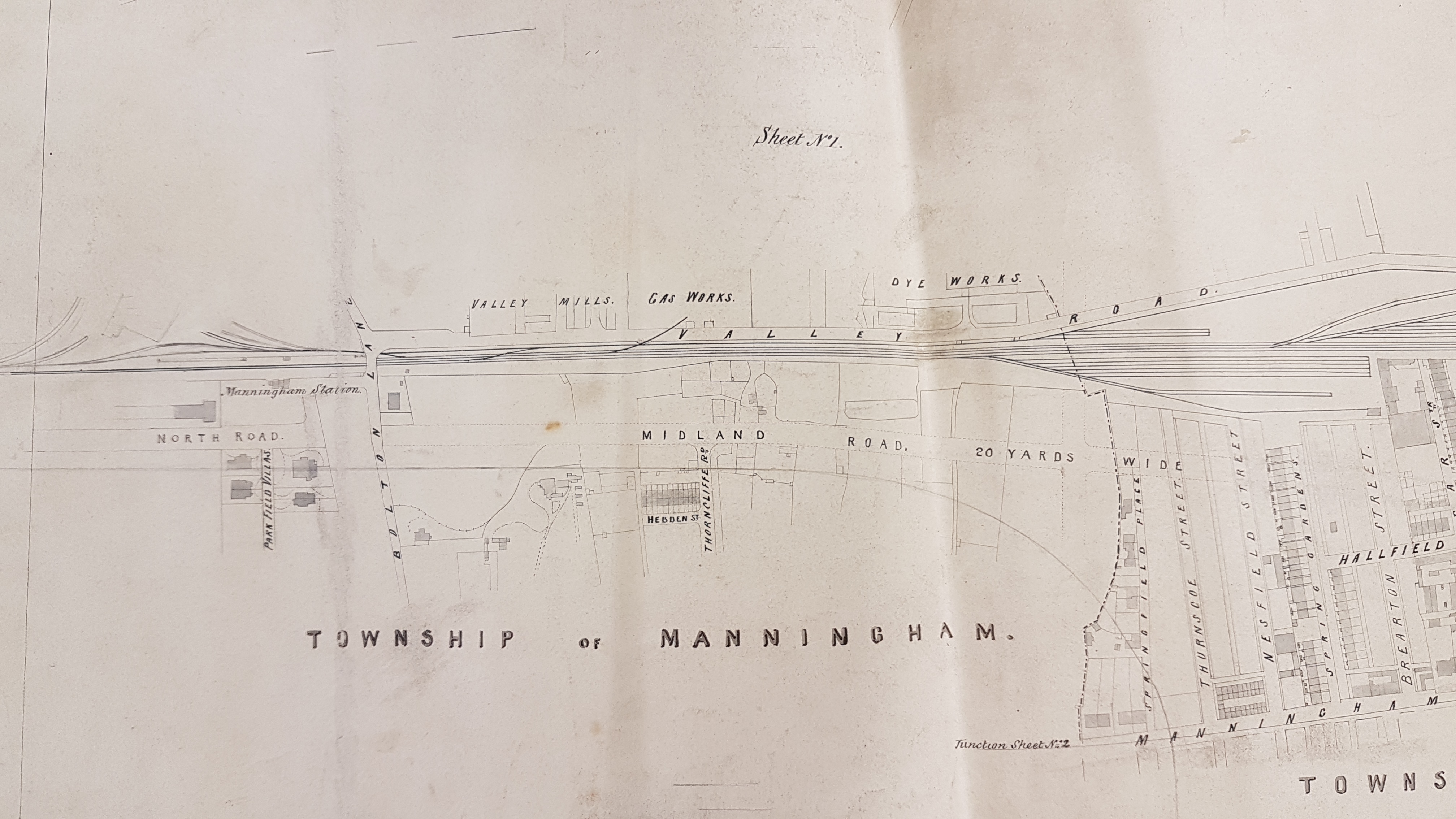 I have shown this plan in two sections. It is not dated or titled although it is marked ‘Sheet no 1’. It may well have been one of a series of such maps. We can be sure that at least one more existed since at the ‘end’ of Manningham Lane is printed ‘junction sheet No.2’. The plan seems to have been a working copy: there are corner pin perforations and several additional pencil lines. It may not show on this reproduction but several sections of track, and the shadowy outline of a building have been added in pencil above Manningham Station. This suggests that the railway and its track is the main focus of the surveyor, although the extension of Midland Road and the street plan between Manor Row and Valley Road are shown in considerable detail. The interrupted line close to Springfield Place is a parliamentary boundary.