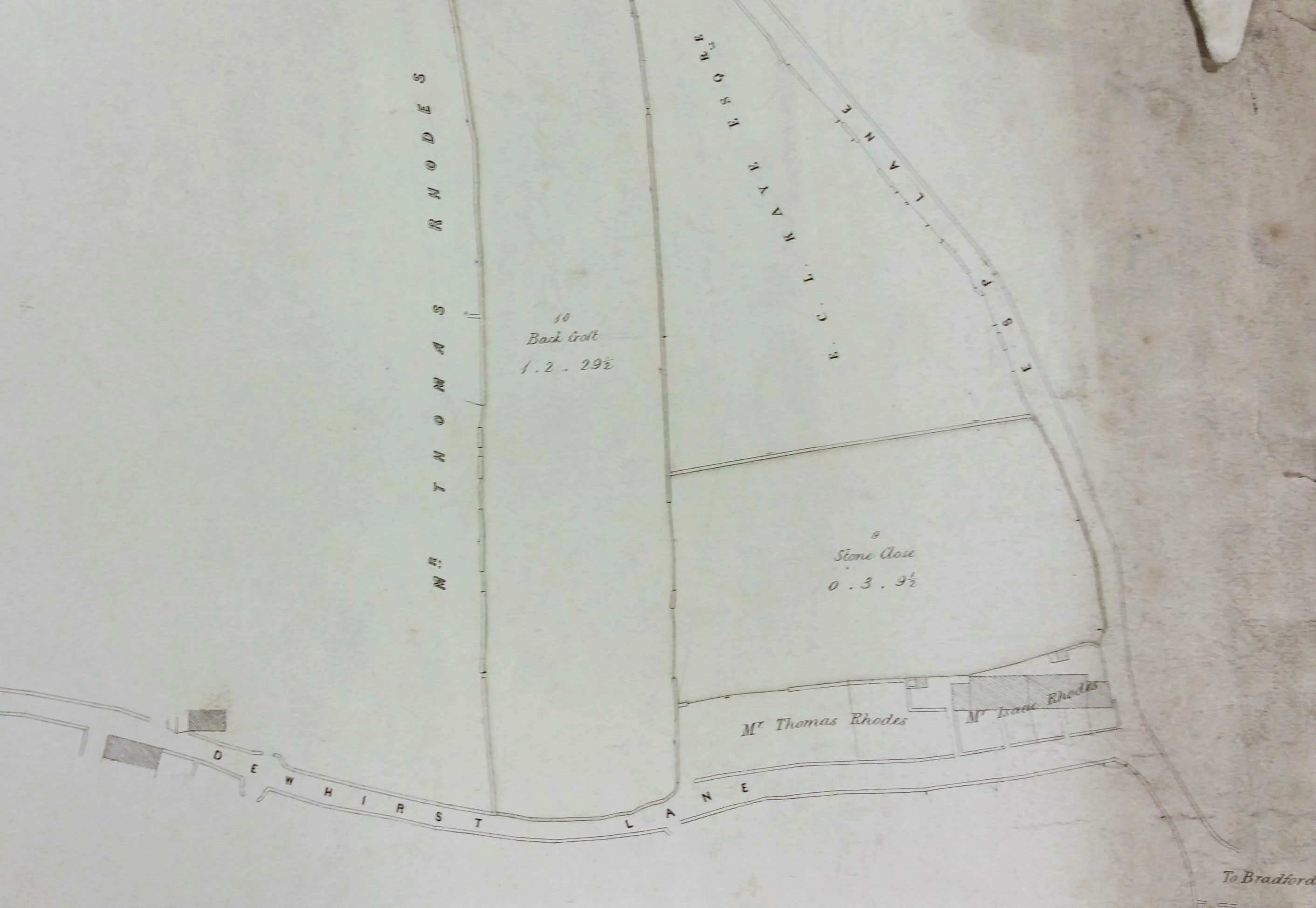 In the first OS map Dewhirst Lane is called Duce Lane. I assume that Dewhirst is formally correct but that ‘Duce’ was a contraction by which it was generally known. Again Cudworth writes:’ (Skinner Lane) was formerly the only outlet from Manningham to Duce Lane (now Oak Lane) which obtained its name from one Dewhirst (locally pronounced Duce) having long been resident there.’ Whatever its name the lane ends at property belonging to Thomas and Isaac Rhodes. Here is joins Esp Lane (otherwise Hesp Lane) which eventually evolved into North Park Road when the land surrounding Manningham Hall was developed as a public open space (Lister Park) after 1870. Here you may just be able to make out the words ‘to Bradford’, at the bottom right of the image, which is approximately the position of the beautiful Manningham Park gates. The road shown here links to Manningham Lane – Keighley Road, which is not drawn.
