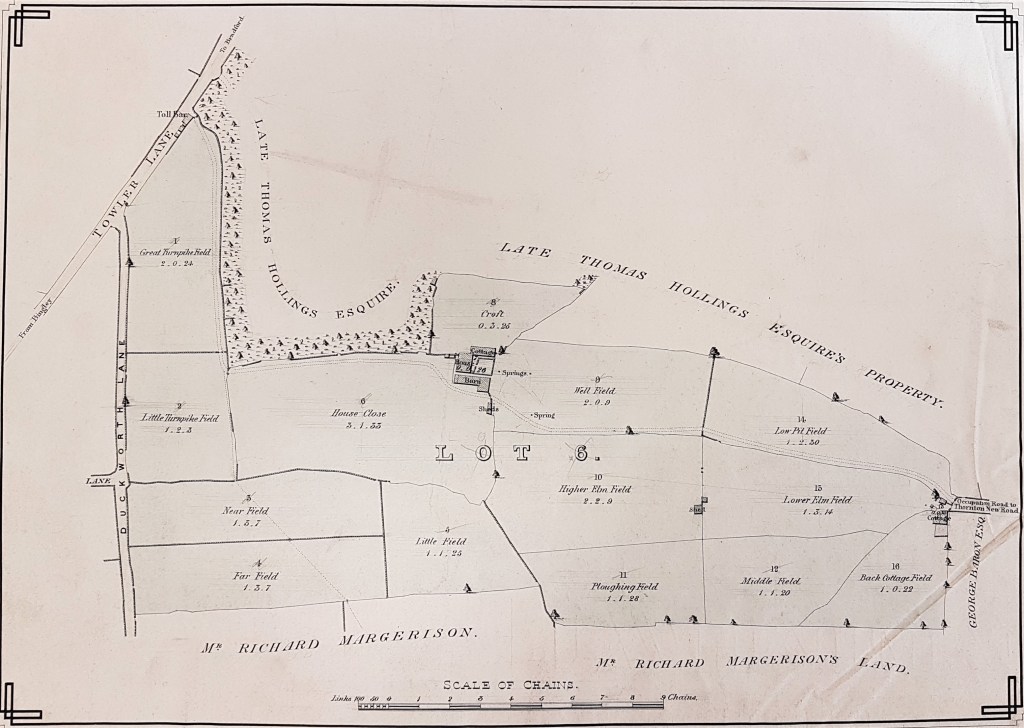 Although untitled and undated this is clearly a land sale plan. It is marked Lot 6 suggesting the whole estate of which it once formed a part must have been fairly substantial. I think that it is reasonable to assume that this lot was initially a small farm consisting of a house, barn, labourers’ cottages, and 14 associated fields. The junction of Towler (now Toller) Lane and Duckworth Lane makes the location of the farm easy to establish.