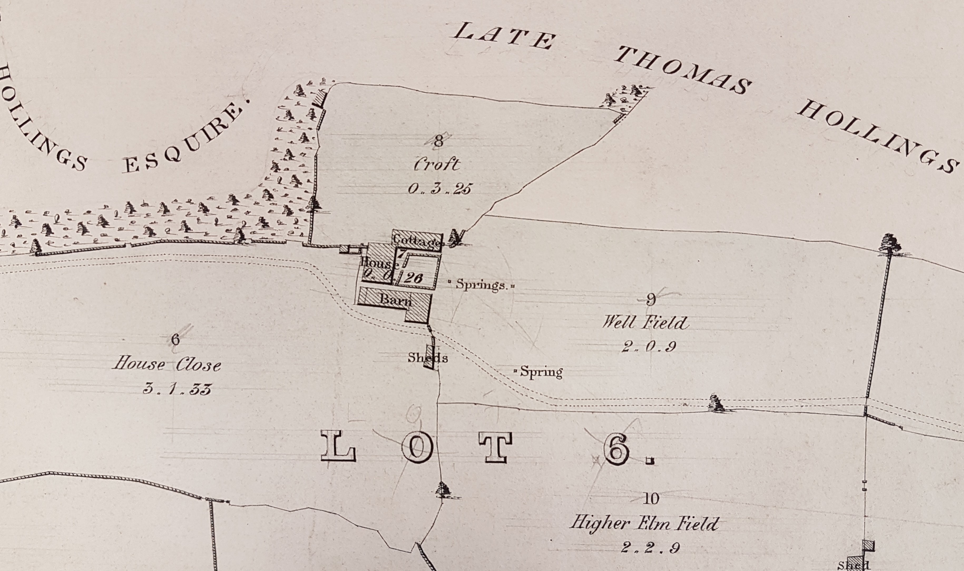 Lot 6 borders the West House estate of Thomas Hollings. The overall arrangements closely resemble the first OS map of the area where the farm buildings are close to the word Gerlington (sic). The cottages on the extreme right of the map (south) are named in the OS map as White House, and Occupation Road joins New Thornton Road at the Round Thorn.