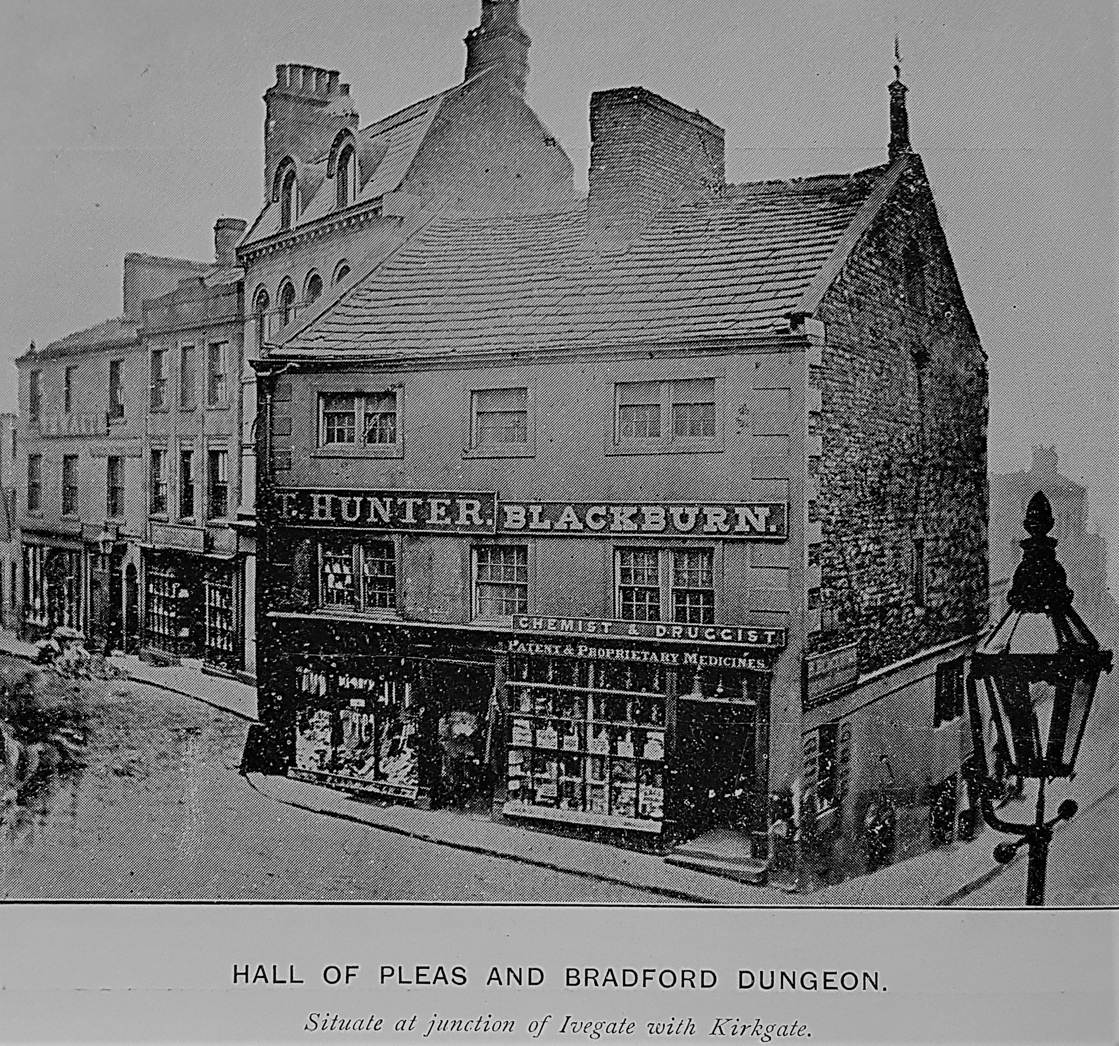 At the junction of Kirkgate and Ivegate you may just be able to read a note indicating that this was the site of the Old Market Place and the Toll Booth, which seems to have been a Hall of Pleas where the ancient courts baron and court leets were held. A dungeon is marked which was deep below the Toll Booth. Cells are still visible in Sunbridge Wells which must I think be from the dungeon. These cells seem to have incorporated a quarry edge which must date from an even earlier Bradford.
