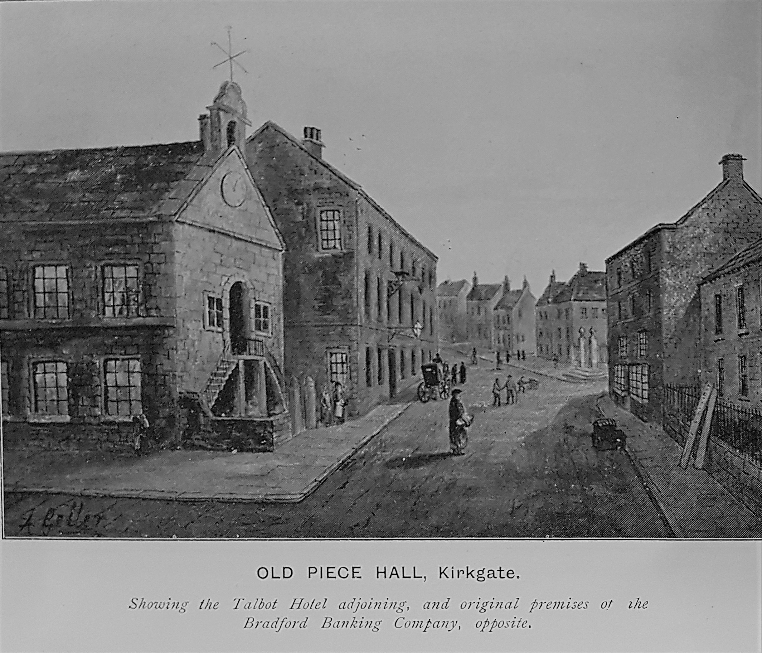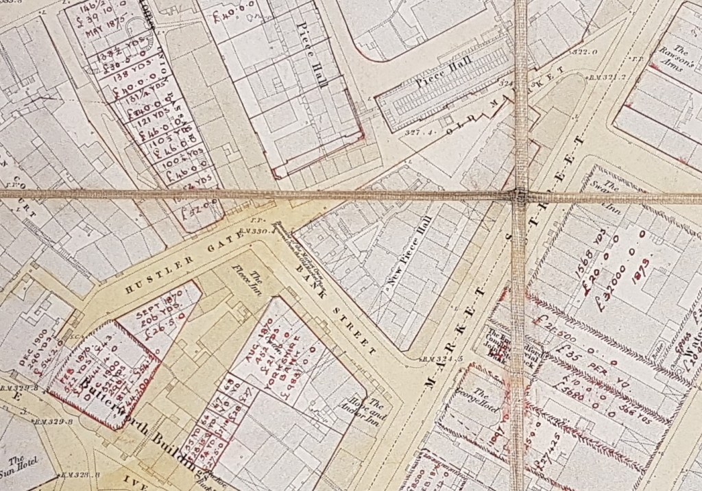 The perimeter of the Wool Exchange is drawn in red. On the 1852 map section above one of the cluster of subsequently demolished buildings is described as ‘New Piece Hall’. Immediately north of this is an unnamed narrow thoroughfare which is now Piece Hall Yard. I understood that this was the original location of an eighteenth century Piece Hall. The illustration must be the Kirkgate end of this building whose location is identified by the presence of the Talbot Inn. However on the map is a second Piece Hall at 90 degrees with a frontage on Old Market. Truthfully you could devote weeks of study to this map and still not exhaust its resources and I very much hope I might interest a reader in doing exactly that.