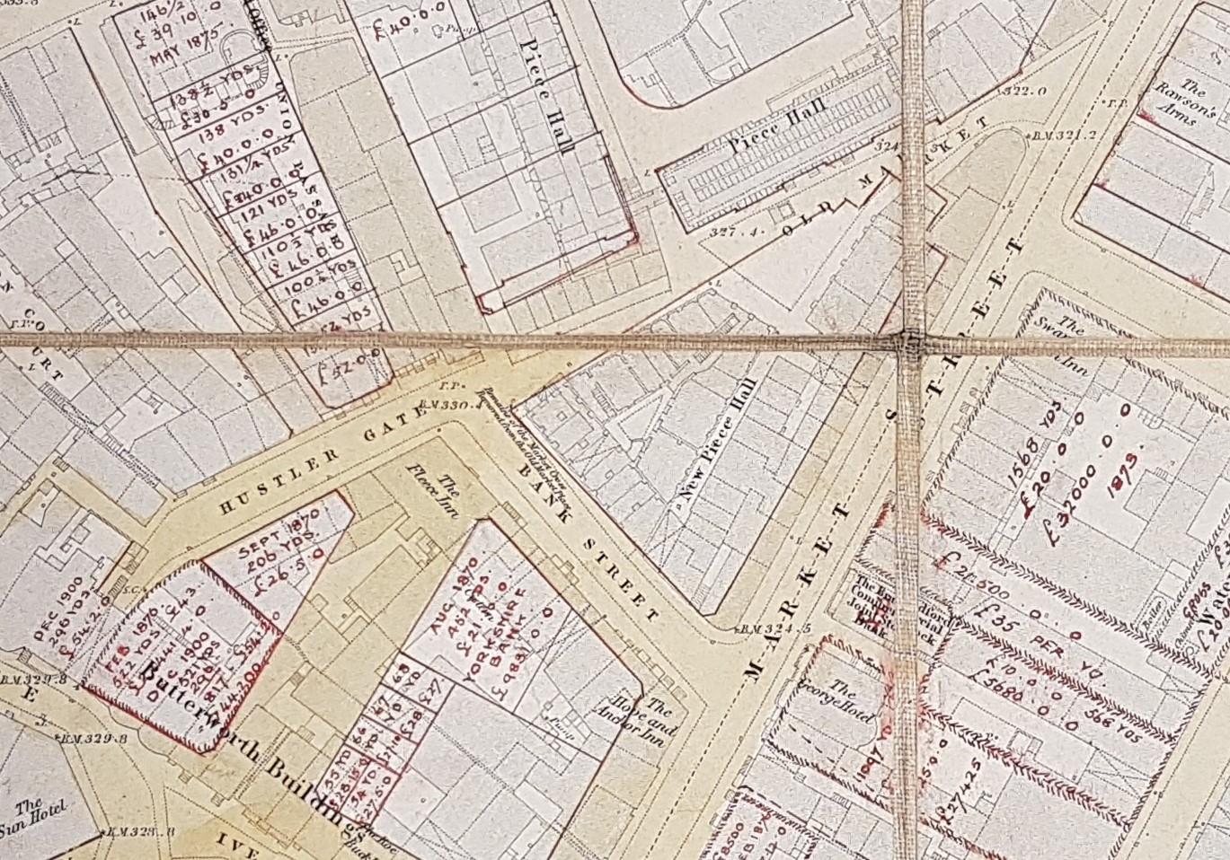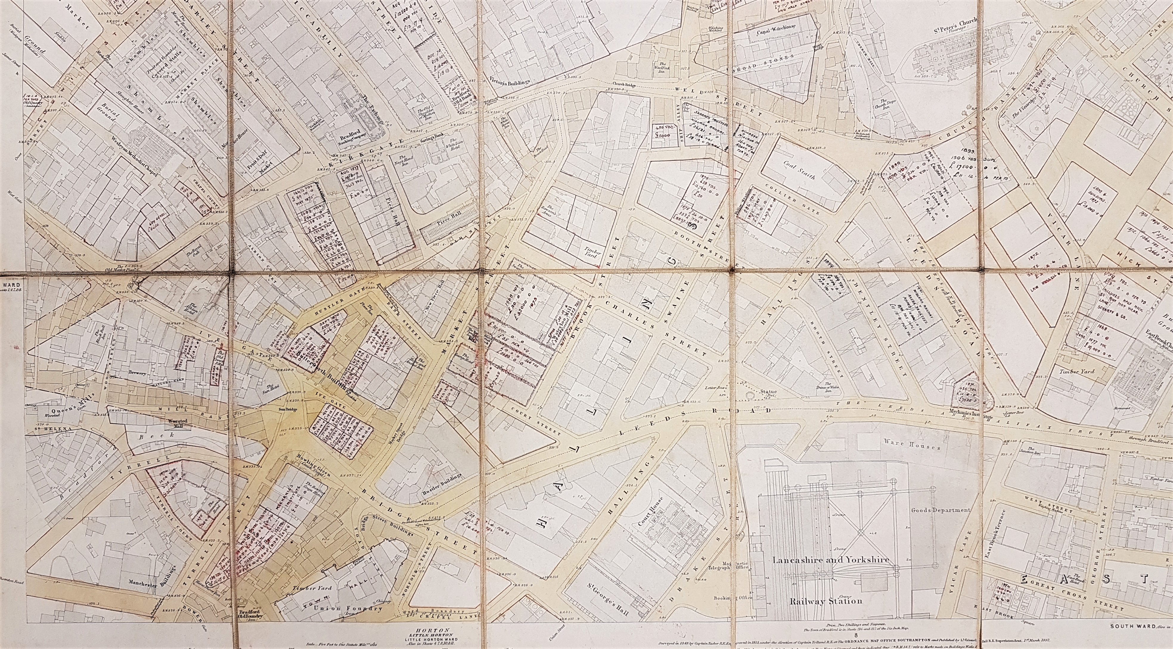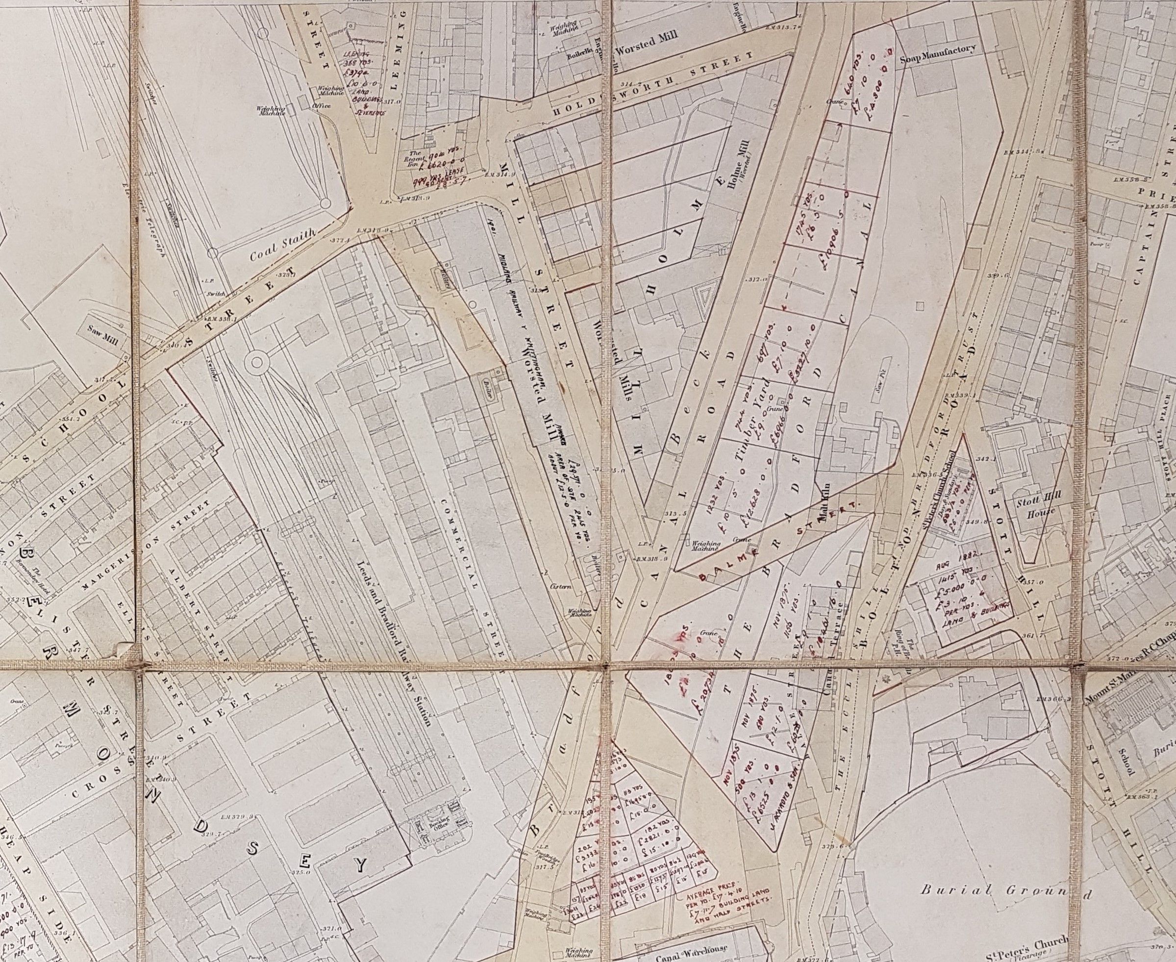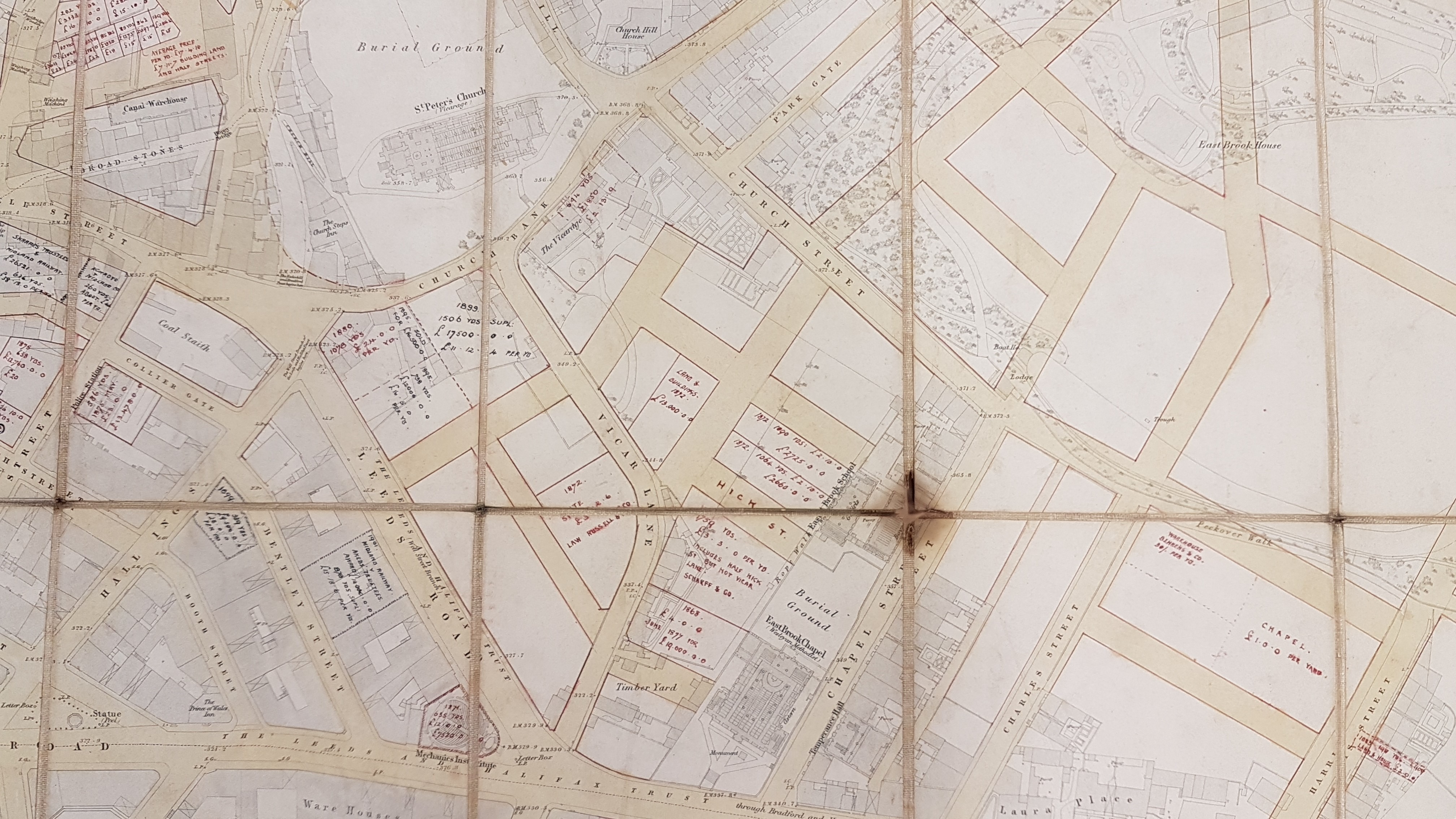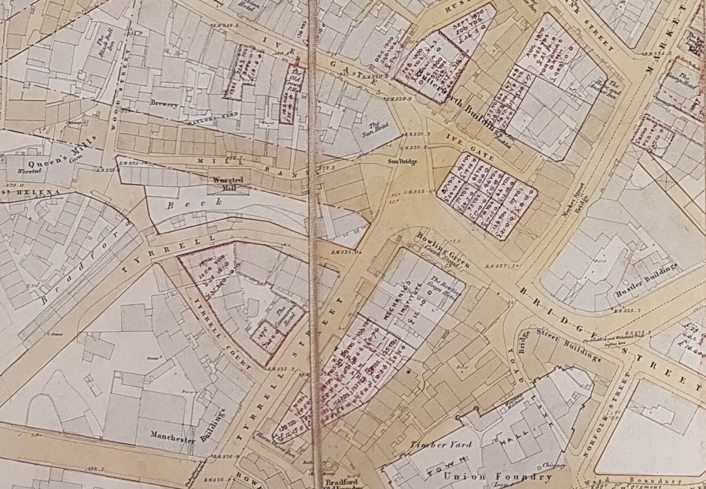 This map was kindly brought to my attention by Mick Birdsall. The sections reproduced are taken from sheet 5 of the 1852, 5 feet to 1 mile, town plan of Bradford. It is believed that plans like this were published for towns in Yorkshire & Lancashire with populations over 4000. This particular sheet has been over-lain with a more recent street grid. In addition to long established thoroughfares it includes more recent streets created in newly developed areas. To illustrate some of the locations I have also included some images taken from Old Bradford Views: from the Cudworth Collection (1897). The unique feature of this map is that annotations in some locations show quite detailed land and property sale prices, area in square yards, and what appears to be the names of contemporary owners. These additional entries are made in red ink and are often dated. As far as I can see the earliest date is 1865 and the latest 1900: the bulk are from the 1870s but the profusion of entries would make a mistake easy to make. I don’t find copperplate script easy but written in the bottom right corner of the map is a name which I think is Mawson & Hudson, architects. If I am correct this partnership was located at 2 Exchange Buildings, Market Street (see the 1891 and 1902 Bradford Directories). The original Mawson must have been William Mawson (of the more famous partnership of Lockwood & Mawson) but he had died in 1889. Mawson & Hudson designed Cleckheaton Town Hall, but who the partners were during the creation of this map I am uncertain. Presumably it represented a brief account of projects in which the partnership had been involved.