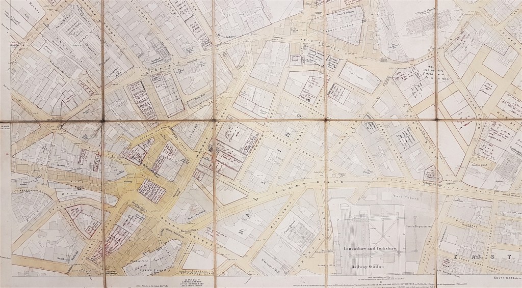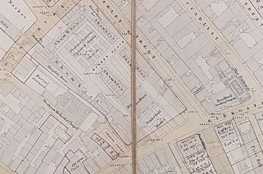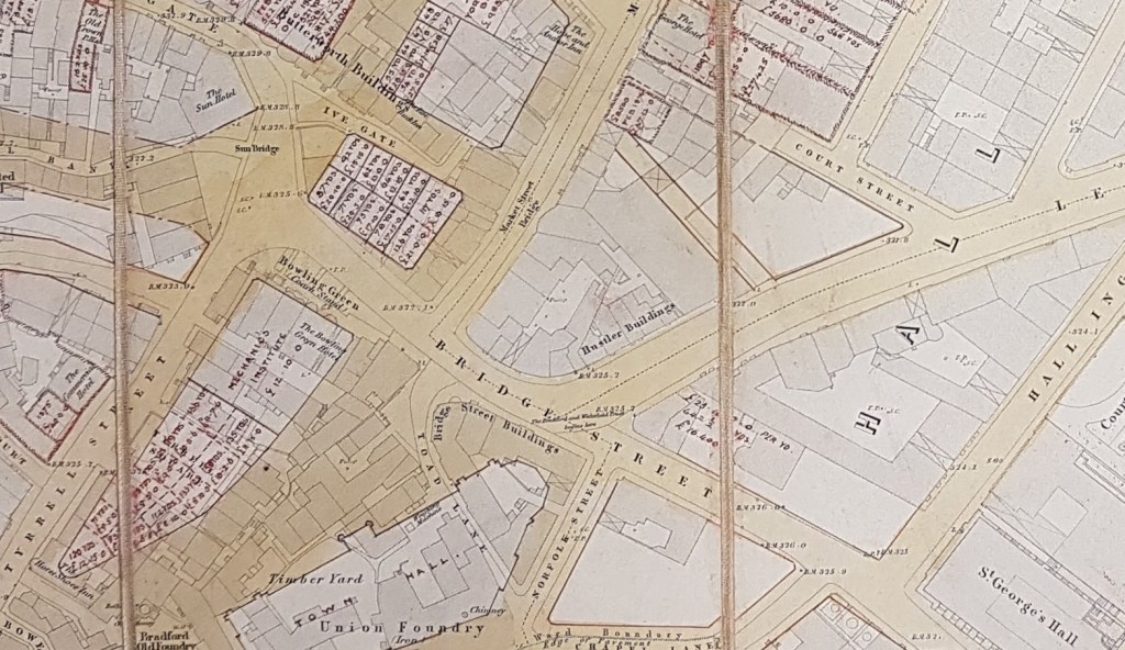 At the left bottom edge of the map we can see very clearly how Bradford Town Hall (constructed 1873) was imposed on the existing buildings. There must have been wholesale demolition of earlier industrial premises.
