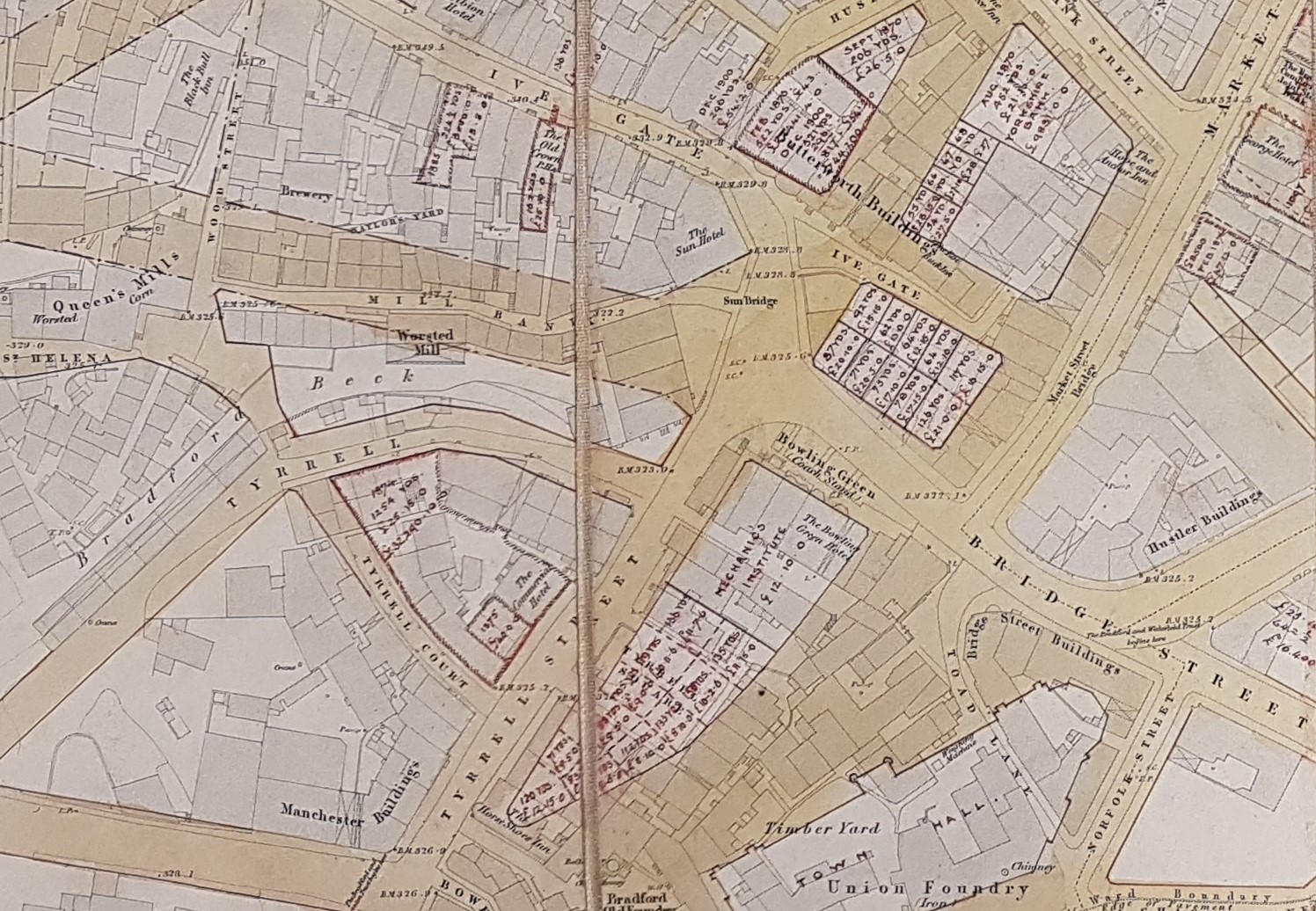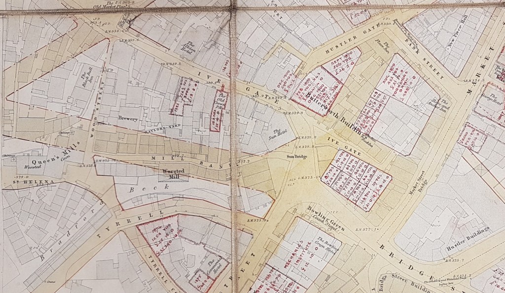 The map incorporates many interesting features. The point of origin of the trusts that built the various Bradford turnpikes is clearly indicated, as are the locations of the various Bradford inns. At the bottom left corner of the map you can see the Bradford Beck. Close to this is a forgotten district called St Helena and the Queens Mill (previously the Soke Mill) which is still divided between corn and worsted milling. Immediately above this dotted red boundary lines indicate the course of the planned, but as yet unnamed, Sunbridge Road. This was created as recently as 1875 which helps date the addition of the street plan.