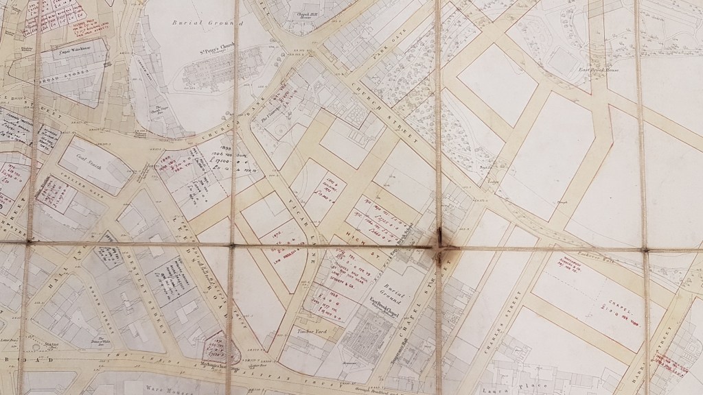 This portion of the map shows the area which became known as Little Germany. The original 1852 map shows East Brook Hall and the extensive park that surrounded it, including a lake and Peckover Walk. The Little Germany street grid, but without street names, is superimposed. There are no further annotations which leads me to suppose that these architects were not involved with its development. The area around the parish church (now Bradford Cathedral) is also entirely untouched. South-west of this is a coal staithe on Collier Gate. Another ‘old coal staithe’ is off Leeds Road and was supplied by a mineral tramway from Bolling Iron works.