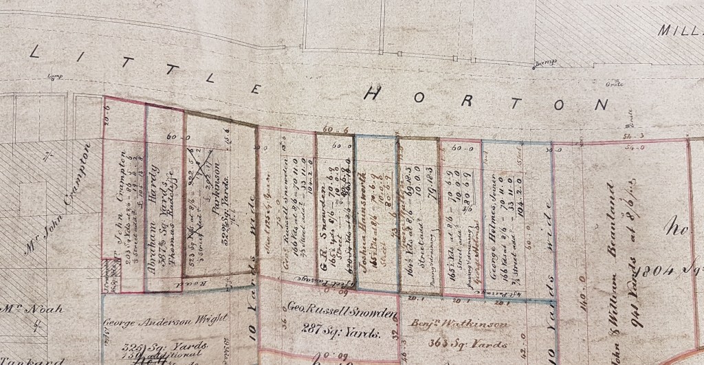 This is that rarity: a map with a precise date and an exact location. It is annotated on the reverse, twice, ‘Revd G Wright’s land, Little Horton Lane, 1847’. It features the junction of Great Horton Road, Little Horton Lane and Manchester Road and provides detailed information about all the occupiers. It roughly corresponds with a map published on this site which I called Bradford at the time of Queen Victoria’s Coronation 1837. Detailed study of both maps reveals the rapid development of the city during this decade. Interestingly the style and hand-writing of the two maps is very similar and it is hard to believe that they didn’t originate from the same surveyor.