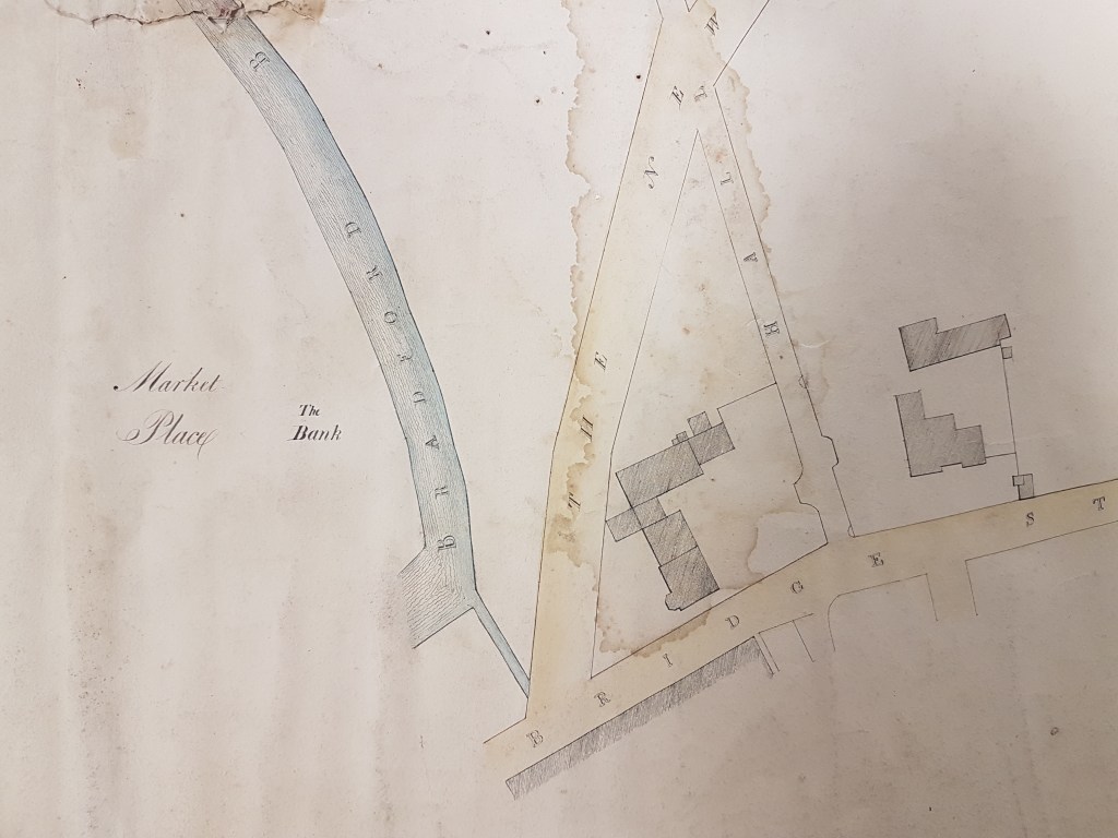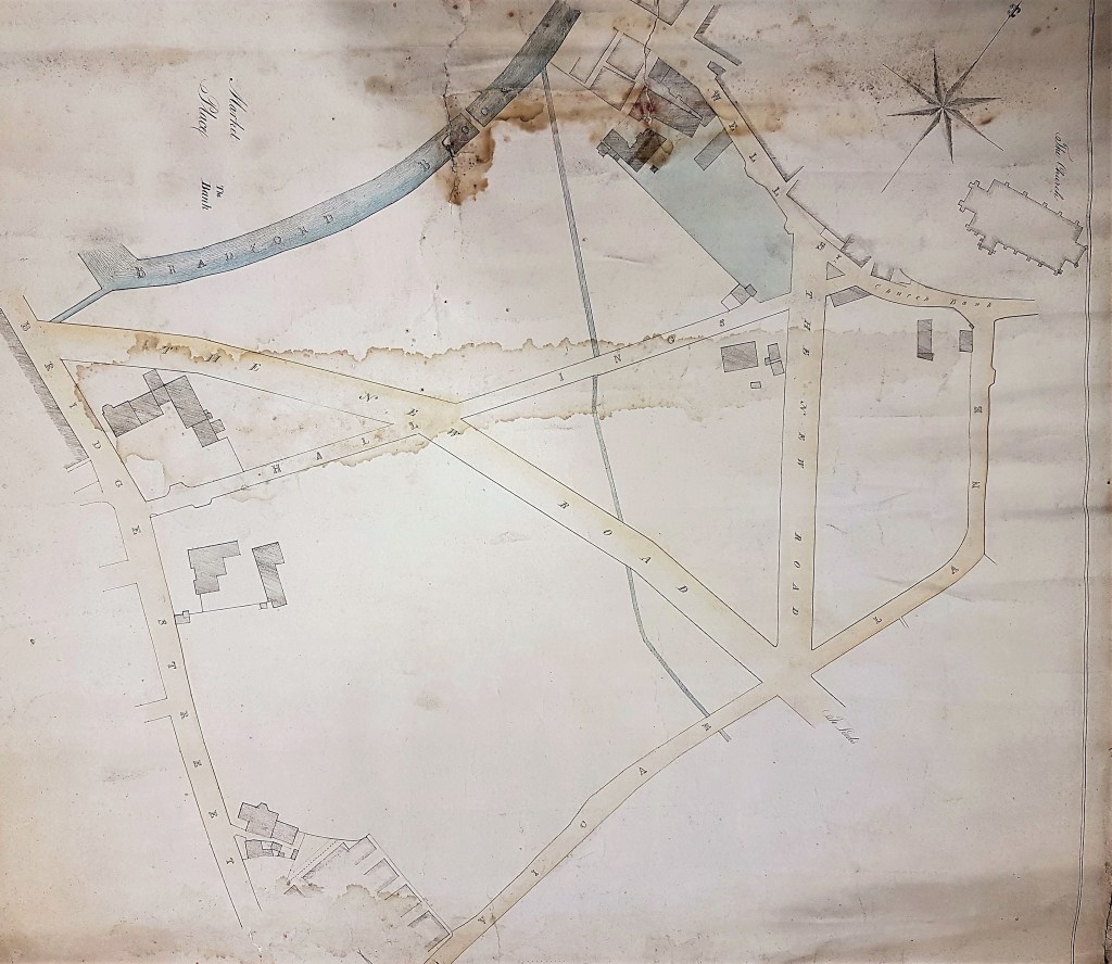 Comments: BRA/PLA. This is an early map of Bradford which has suffered quite severe water damage at some stage. The map is not easy to interpret since it differs very considerably from the modern street plan. At least St Peter’s Parish Church (now the Cathedral) is included which is a huge help in orientating yourself. I would suggest rotating the map so that north in the direction indicator points to 2 o’clock. The map is undated but helpful clues are the absence of the old GPO building (1886) and Exchange Station (1850). These omissions would certainly place the map in the first half of the nineteenth century which would fit stylistically. The absence of the first Mechanics Institute (1831) but the presence of the ‘New Road’, later Leeds Road and then Well Street (1825), suggests a date around the year 1830.