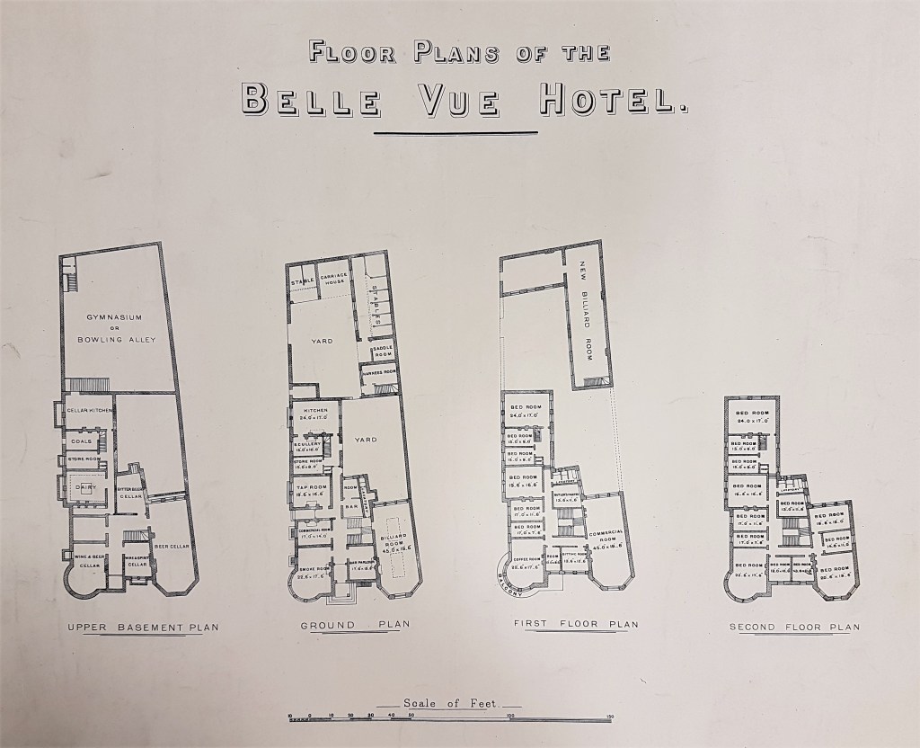 I’ve given the map a provisional date of c.1875 and this fits the style of the plan, although I suppose that in reality the Belle Vue would needed to have been open for some time before a ‘new’ billiard room was needed to supplement the old. The facilities available on the various floors are fascinating. Was there really a gymnasium in the basement and why did you need a separate beer cellar and bitter beer cellar? On the ground floor the bar accommodation seems fairly complicated by modern standards: was a ‘tap room’ less comfortable than ‘the bar parlour’? It seems odd to me that if beer was available ‘on tap’ in the tap room it was not conveniently placed above one of the beer cellars. There is a kitchen, and presumably meals were cooked for residents, but there is no dedicated dining area. Did you eat your meals in one of the bars, or in the very large coffee room? Possibly most of the residents were ‘commercials’ since accommodation was set aside for them on the ground and first floor. There was ample space for billiards to be played, not snooker of course which was only introduced to Britain in the late 1880s.