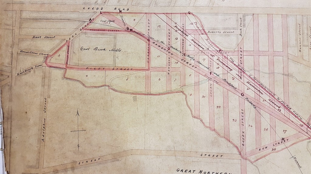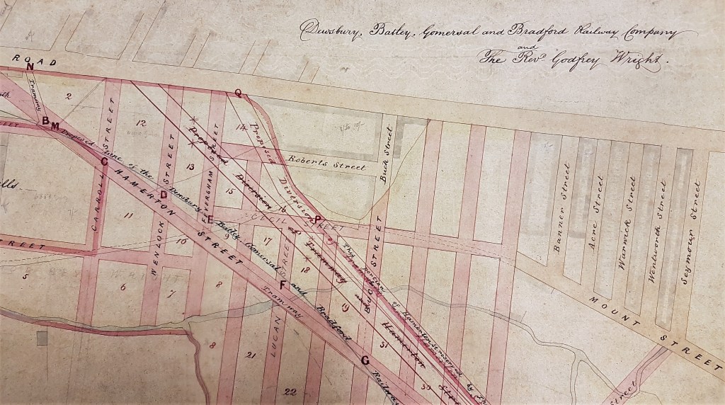 The company name was not familiar to me. It appears in Bradford Observer share advertisements first in 1860, although none of the original promotors were Bradford businessmen. It would appear that the railway company were planning a 7 miles line from Batley to Bradford, via Gomersal and Birstall. The line would have originated at an independent station near the junction of Leeds Road and George Street and, passing north of Eastbrook Worsted Mills (through the Low Moor Iron Company coal staithe), have left Bradford next to Hammerton Street. An expensive part of the project would seem to have been a planned tunnel, 1.5 miles long, conveying the line under the Leeds, Bradford and Halifax Railway junction and on to Birstal. The position of the tunnel entrance is marked on the plan. The project would have been associated with the creation of a large number of residential streets in east Bradford. It is clear that the larger London and North West Railway Co. were involved but a bill proposed to Parliament was withdrawn when only £60,000 could be raised locally rather than the £200,000 required. I do not find the name of the company in newspapers after April 1861 and evidently no such railway line was constructed.