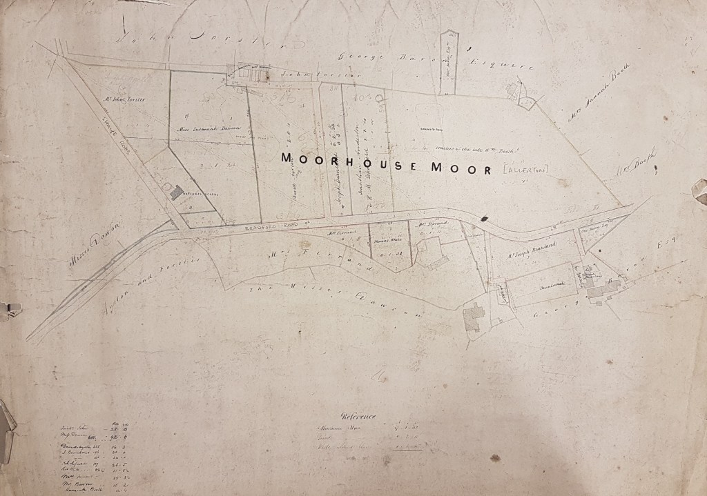 A search in the Bradford Observer has only been partially successful in explaining the reason for its existence. In the years 1839-1844 some property of the Joseph Beanland, whose name you can see, was sold after a case in the Chancery Court called Beanland v Halliwell. This case seemed to be concerned with whether a mortgage should be paid first after testator’s death. Papers concerning the case are in the National Archives if anyone is interested. The Moorhouse Moor estate was then sold, along with other estates, in 1850. I don’t know who the vendor was or whether the sale was connected to the Chancery case.