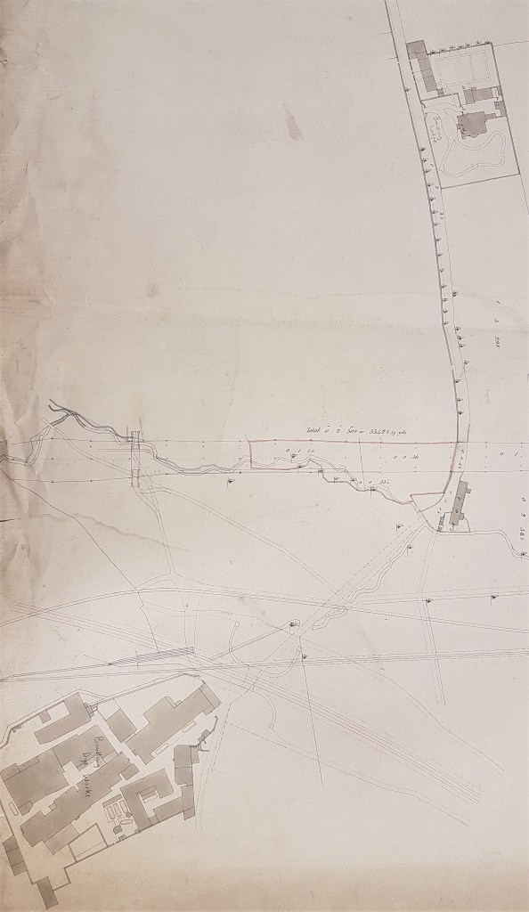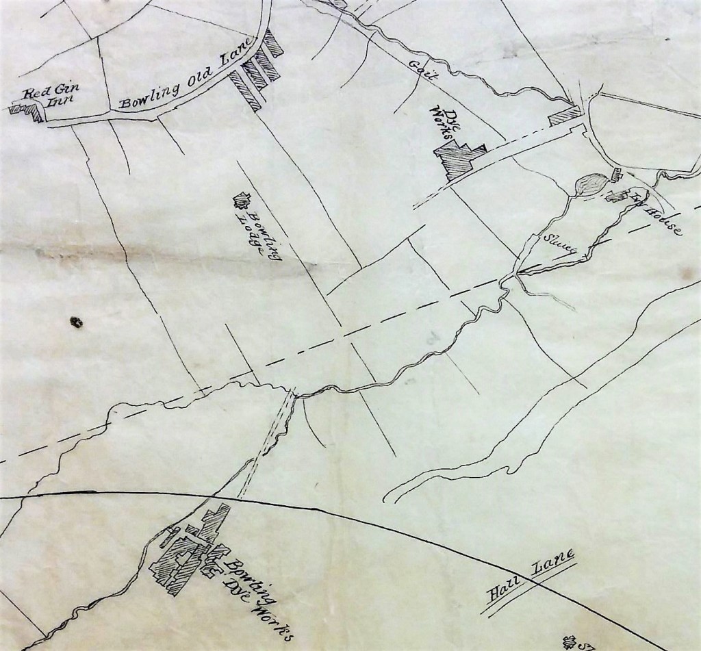 Determining the map’s exact date is quite difficult. The Bowling Dye House had been built at Spring Wood (which is not mapped) in 1822 but the business had been founded much earlier by the grandfather of HW Ripley. Bowling Lodge was built for HW Ripley in 1836. The straight course of the Lancashire and Yorkshire Railway into Drake Street (Exchange) Station should be present in maps after 1850 but appears to be missing here. What are definitely missing on these maps are the Dye Works’s huge reservoir and several dye pits although these are clearly present on the 1849 Bradford borough map. I’m not sure exactly when the new second Dye Works was constructed but it was certainly also in existence by 1849. The curved track from Bowling Junction to Laisterdyke was opened in 1854: it enabled Halifax to Leeds trains to avoid delays caused by entering and reversing out of Bradford. Clearly it is not possible to derive a single date that explains the presence and absence of all these features.