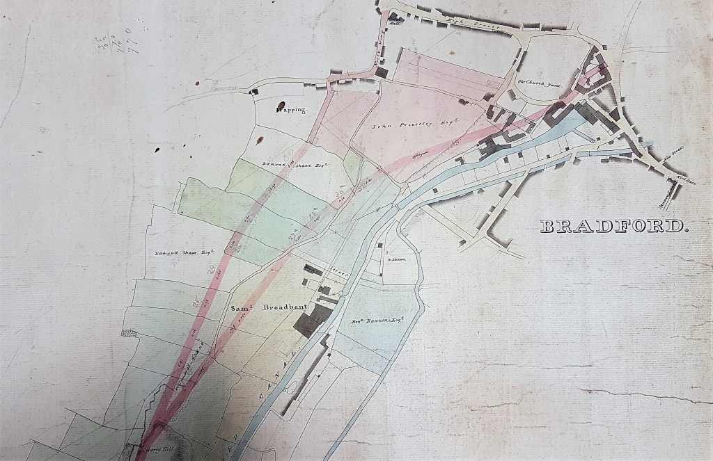The Old Church Yard is drawn on the map, but curiously not St Peter’s itself. The Bradford Beck, Canal basin and the canal itself are easily visible. You can see the name John Priestley. I believe this was ‘Captain’ John Priestley (1776-1832) who served in the Bradford militia and was the son of Joseph Priestley, instigator of the Bradford Cabal and for many years was the canal engineer, a most important post. If I have the right man John’s date of death is another clue to the date of the map.
