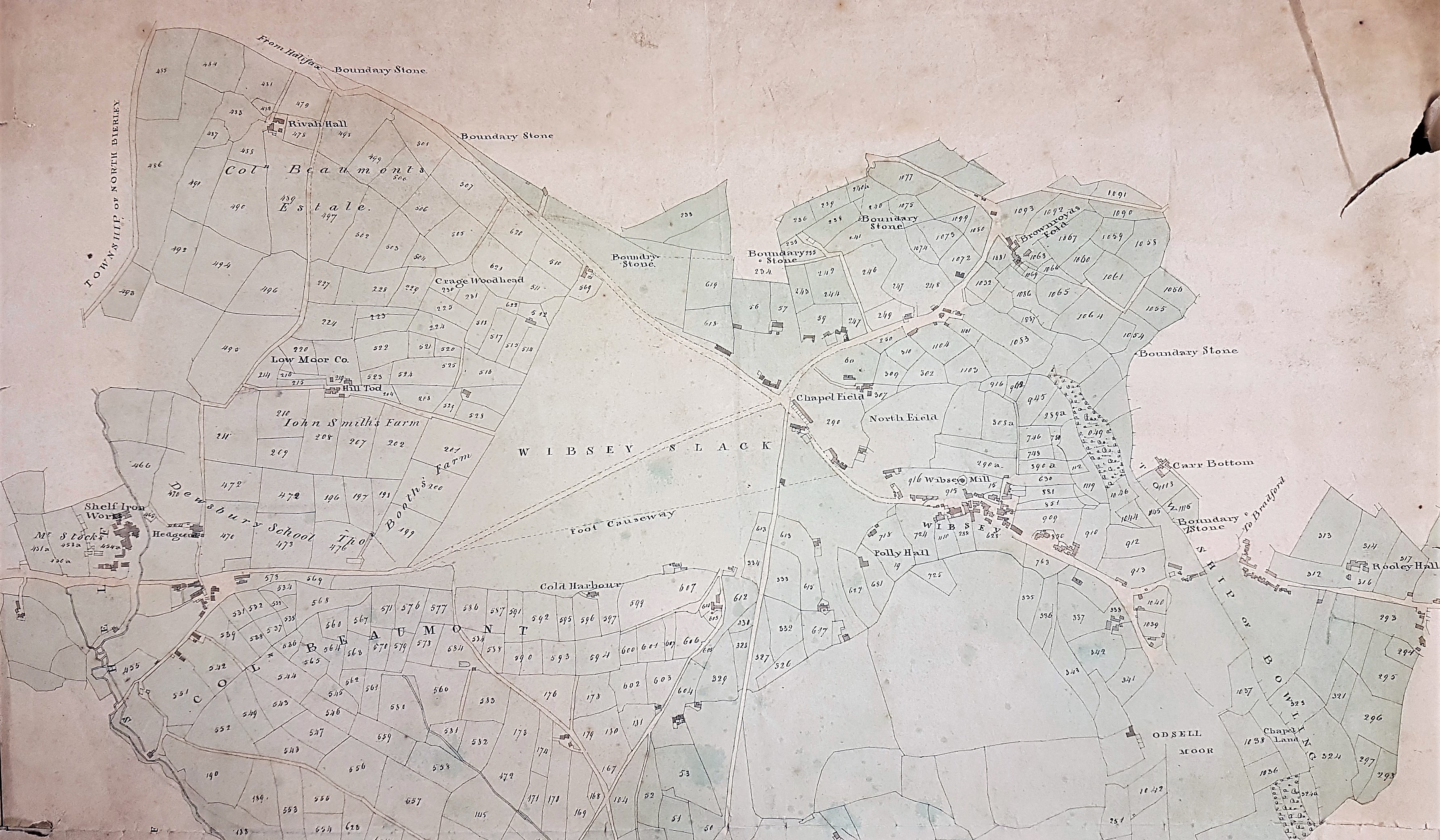 This detailed map is only marked ‘Plan of the Township of Shelf’ with no explicit comment about its age and purpose. I’ve given it a provisional mid-19th century date but this is mere guess work until such time as more detailed study is possible. It is a little hard to believe that this lovely map is not a copy of one already in the permanent collection, but with Covid restrictions I’ve no way of checking this at present. In 1828 or 1829 surveyor Joseph Fox drew up a similar map recording the property of the Low Moor Iron Company, although that map is entitled ‘North Bierley’. I should add, for the benefit of readers who don’t know this region, that the Low Moor and Bowling Iron Companies smelted iron ore, obtained locally from the roof of the Black Bed coal seam, using coke made from the deeper Better Bed seam. The production of cast iron and ‘best Yorkshire wrought iron’ was extremely profitable for more than a century. The West Yorkshire Archives (Bradford) have a copy of the Fox map, generously donated by Geoff and Mary Twentyman. The donors suggested that it was kept on display at the Low Moor ironworks, and it has certainly been annotated at a later date. With maps, other than those of the Ordnance Survey or specially surveyed town plans, it was common to redraw an older plan with additions. With maps from this general area I do usually ask the advice of Mary Twentyman who is a noted local historian with a special interest in Low Moor.
