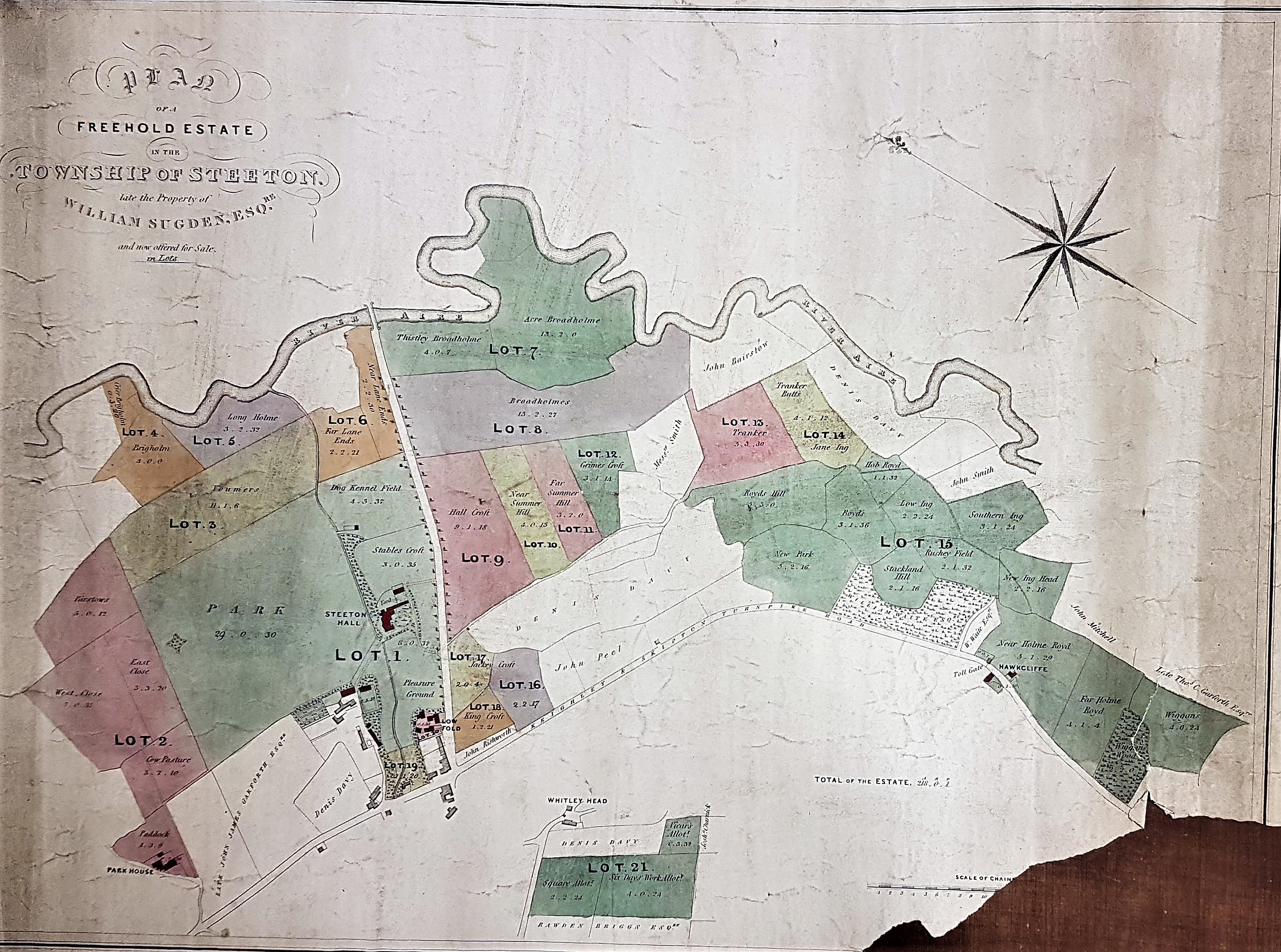 The drawback to this theory is Steeton Hall, which features prominently on this plan. This house is known to be originally early 17th century in date but was rebuilt on several occasions. It was purchased by the Sugden family in 1819 and William Sugden was known to be living there by 1822. If the estate was indeed sold on his death then 1835 would be a reasonable date for both sale and plan, but the Bradford Observer, in various advertisements around 1842-1845, records the fact that William’s son, John Greenwood Sugden (1818-1864), was living there. Moreover he was located at Steeton Hall at the time of the 1851 census. Possibly the whole estate was offered for sale on his own death in the mid-1860s but, if so, why link the property with his father who died 30 years previously? I know nothing like enough Keighley history to resolve this problem. Can anybody help me?