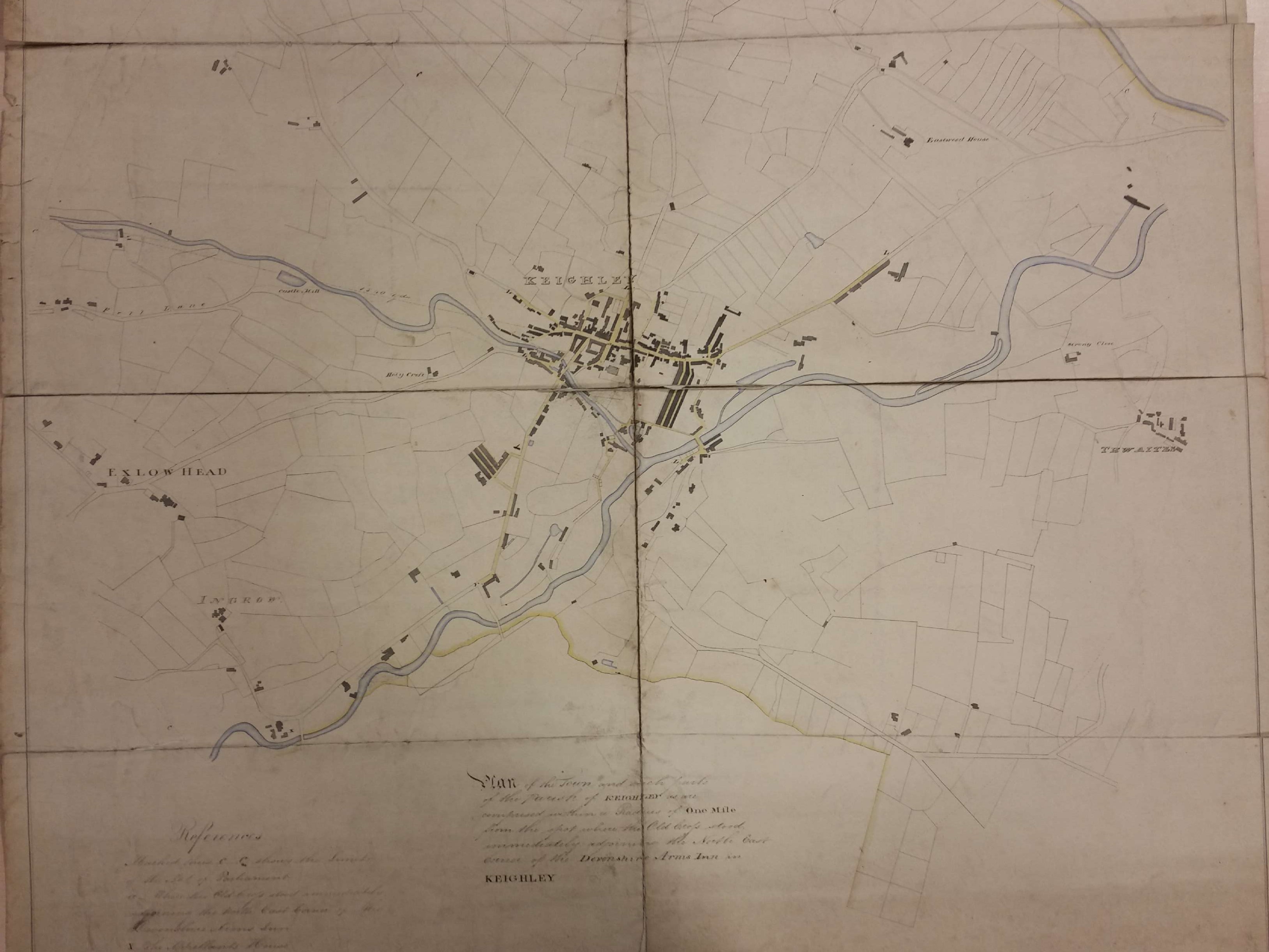 Drawn on this plan is a one mile radius circle, taking as its starting point the Devonshire Arms, Keighley. In addition to Keighley itself this boundary includes the then separate hamlets of Thwaites, Exlow Head and Ingrow. The river Worth and the North Beck are drawn, but not named. North Street, South Street and Low Street are named.