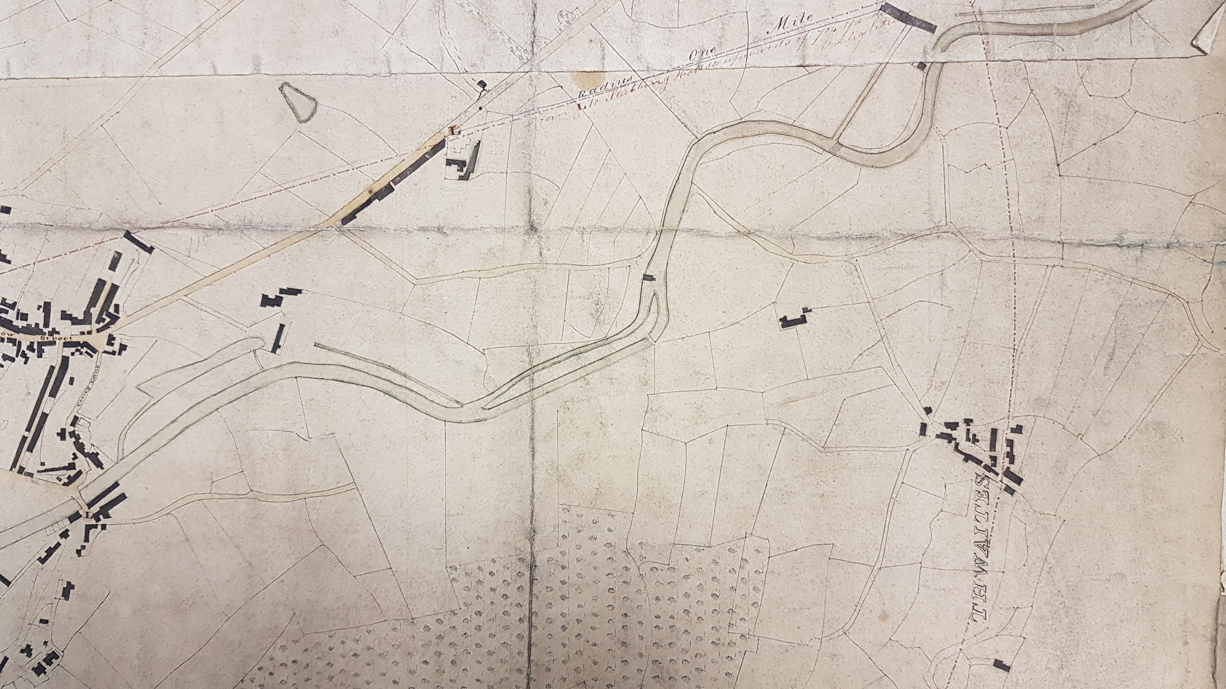 The best I can say at present is that it would appear, along the North Beck, the Castle Mill is built (1783) but the Northbrook Mill is not, although the mill ponds seem to be present. Calversyke Mill is definitely absent and this was constructed in the early 1830s. I’ve suggested a map date of around 1820 but this is not much better than a guess. I have no idea why the 1 mile circle was of importance.