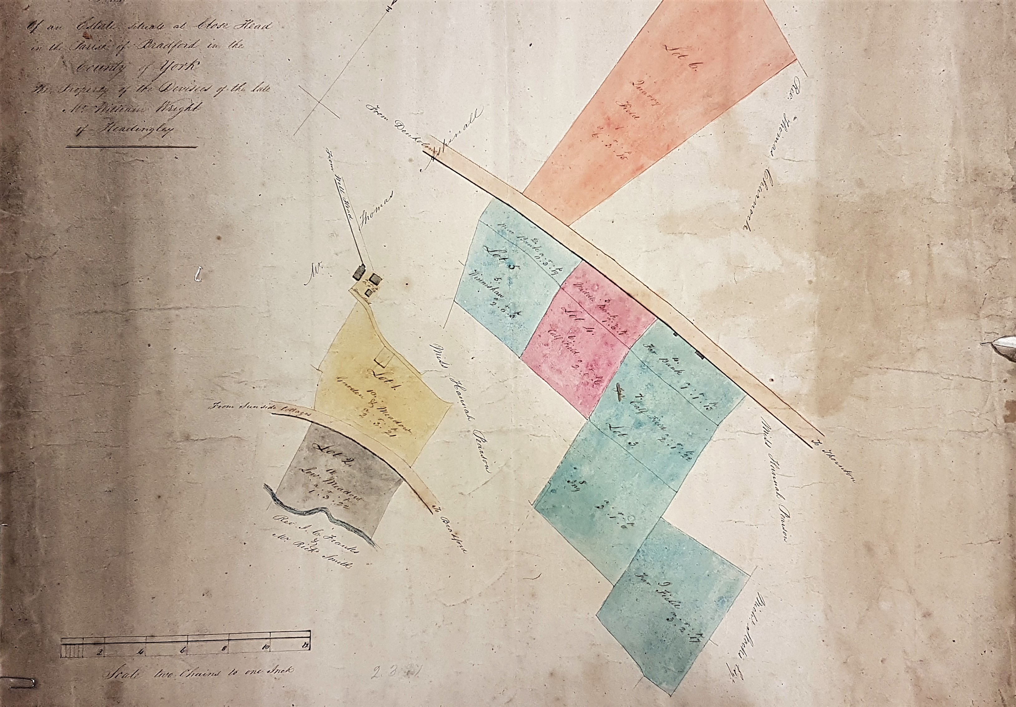 This beautiful, tinted, map is another plan from the Thornton – Denholme area. It is undated but stylistically it would fit the late 18th or early 19th century I would imagine. It is beautifully labelled in copperplate script. The rubric reads: ‘Plan of an estate situate at Close Head, in the parish of Bradford in the County of York, property of devisees of the late William Wright of Headingly’. A devisee is a person to whom something, especially real estate, is left by the terms of a will.
