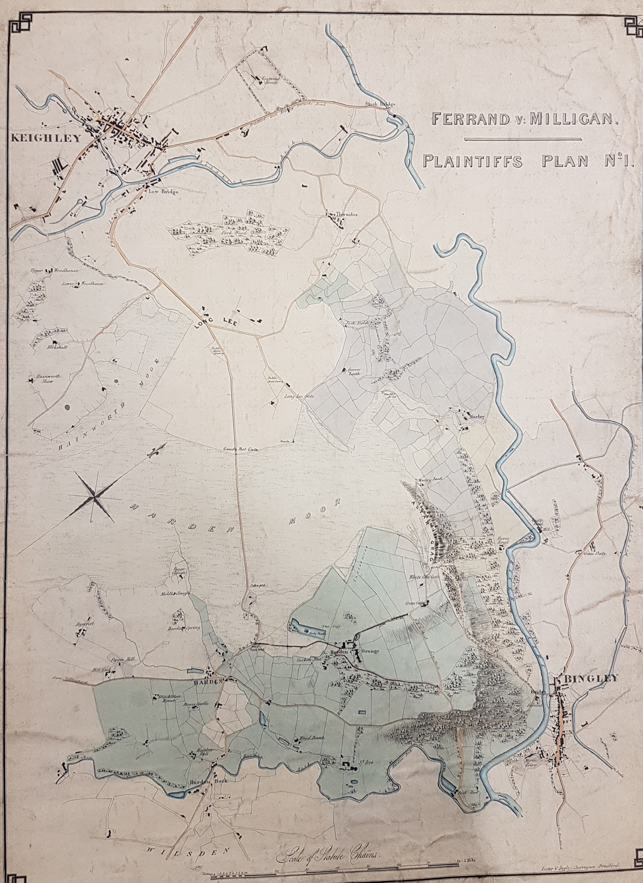 This example is marked ‘plaintiff’s plan No 1’ which dates it to a legal case in 1845. This action was brought to ‘try a right’ (in the person of Robert Milligan, surveyor of the roads) to determine whether the public were permitted to use a road to Harden Grange (now, you remember, called St Ives). Milligan clearly believed he had a right of way past Ferrand’s house, but the jury found that the thoroughfare in question was ‘no carriage road or public foot road’. Despite his victory the plaintiff (Ferrand) was awarded a derisory one farthing damages. An associated criminal case saw the luckless Milligan hauled up for ‘riot and assault’, but this case was eventually dropped. A year later the defendant tried to renew the action, but this was not allowed by the court.