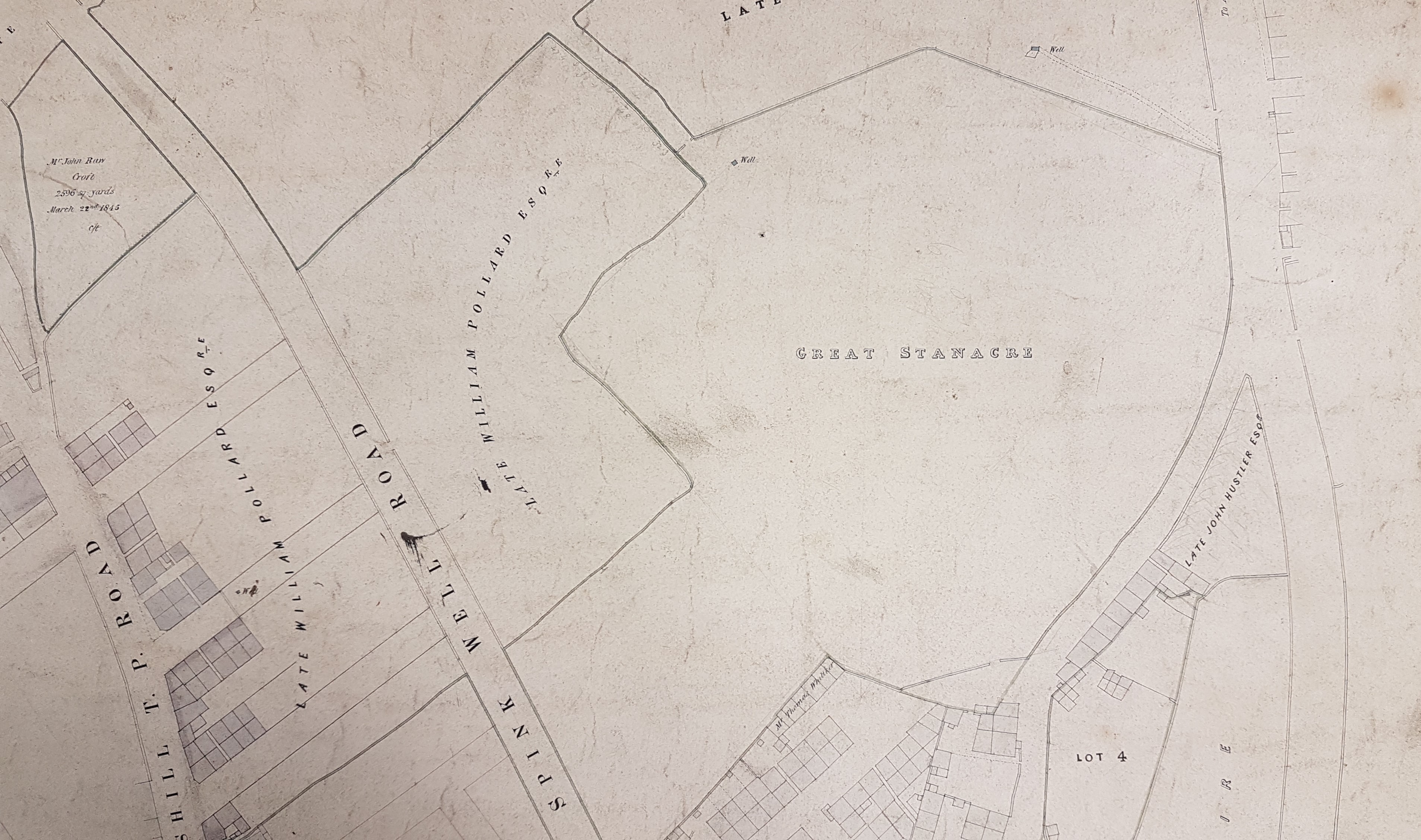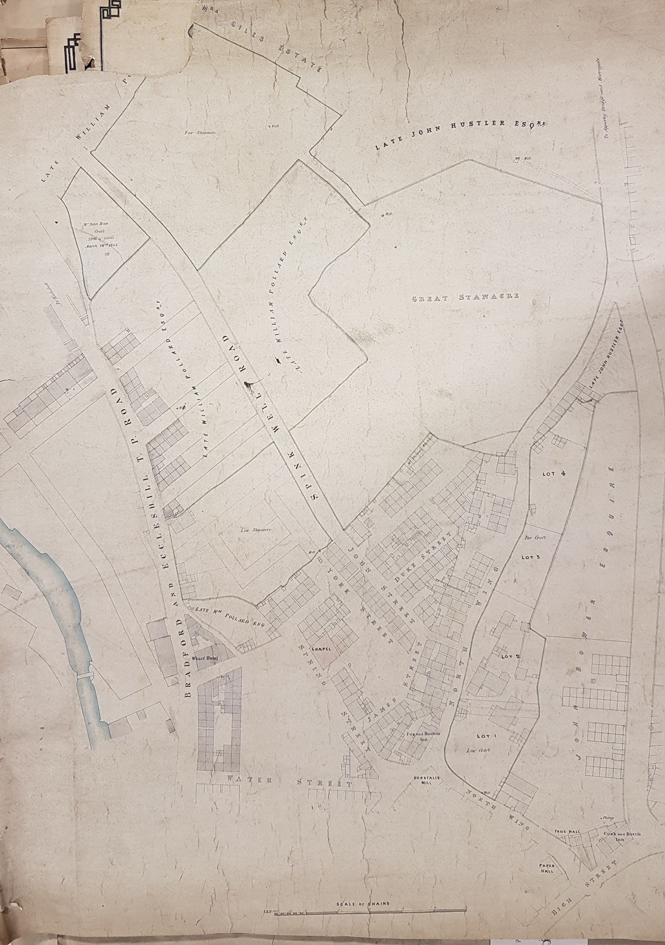 This is an undated, but detailed, sale plan of the area around North Wing. Horsfall’s Mill is marked, as is Paper Hall and the Fox & Hounds Inn. Local landowners include: the late William Pollard, the late John Hustler, and a John Bower.