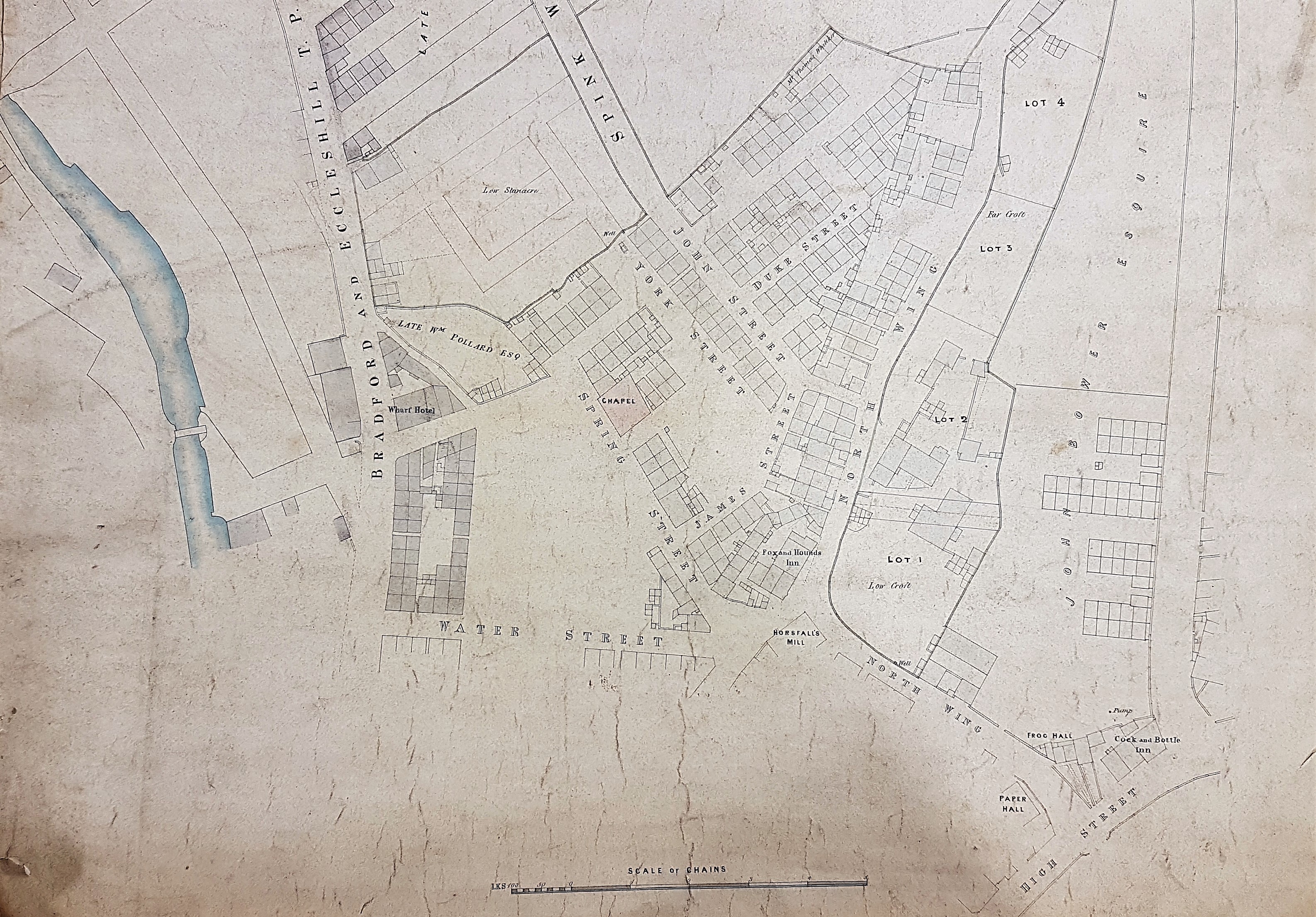 A good place to begin is with Paper Hall at the bottom right of the plan. This seventeenth century construction, one of the city’s oldest domestic buildings, is still extant although its surroundings have changed out of all recognition. North Wing then opened off ‘High Street’ which is the modern Barkerend Road. In the first Ordnance Survey map of the area, c.1850, the whole area east of North Wing is somewhat more developed which indicates that our plan is earlier, but perhaps not hugely earlier. The Fox & Hounds Inn is believed to have been built in the early nineteenth century and was, I understand, demolished during the creation of the Shipley Airedale Road.