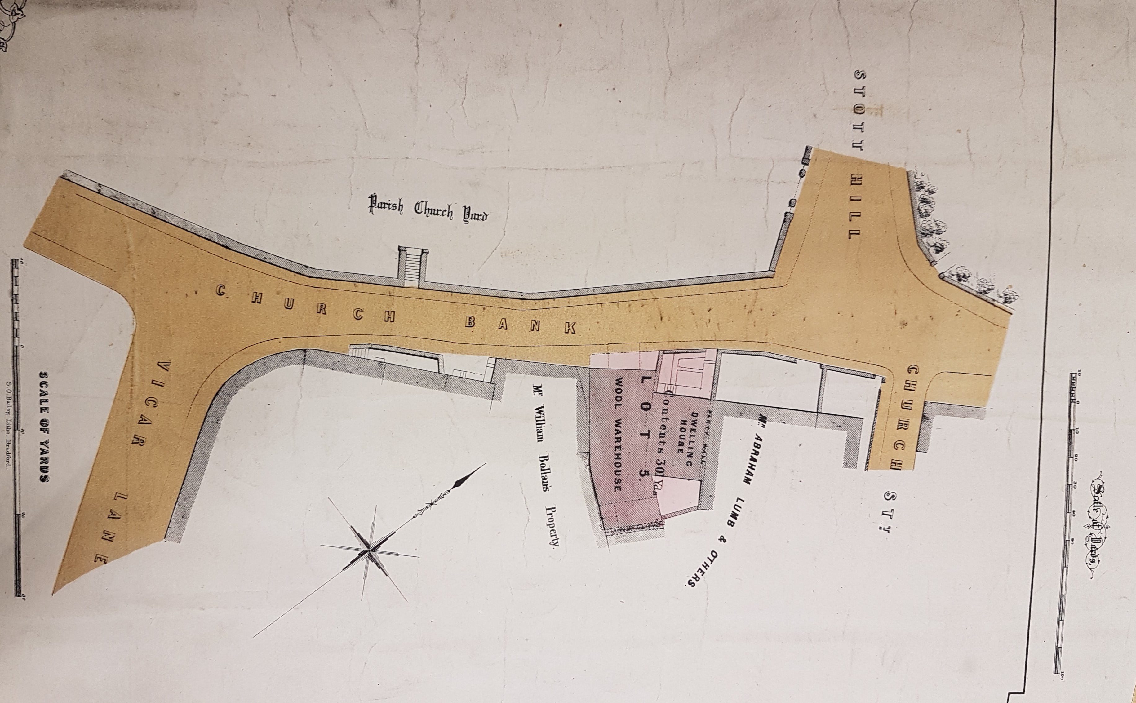 From the second map it seems that Lot 5 is a wool warehouse and a dwelling house, south of Church Bank, sandwiched between the property of William Bollan and Abraham Lumb. The OS maps don’t show this block in sufficient detail to be of any further use, but it is just east of the old Bradford vicarage. I like to link these maps with named individuals. I drew a blank on William Bollan, but in the 1851 census Abraham & Elizabeth Lumb are living in North Parade. Abraham describes himself as a proprietor of land and houses, which sounds promising. On the other hand, in 1841 he was a pawnbroker and in 1861, a retired plumber! Perhaps he had transferable skills.