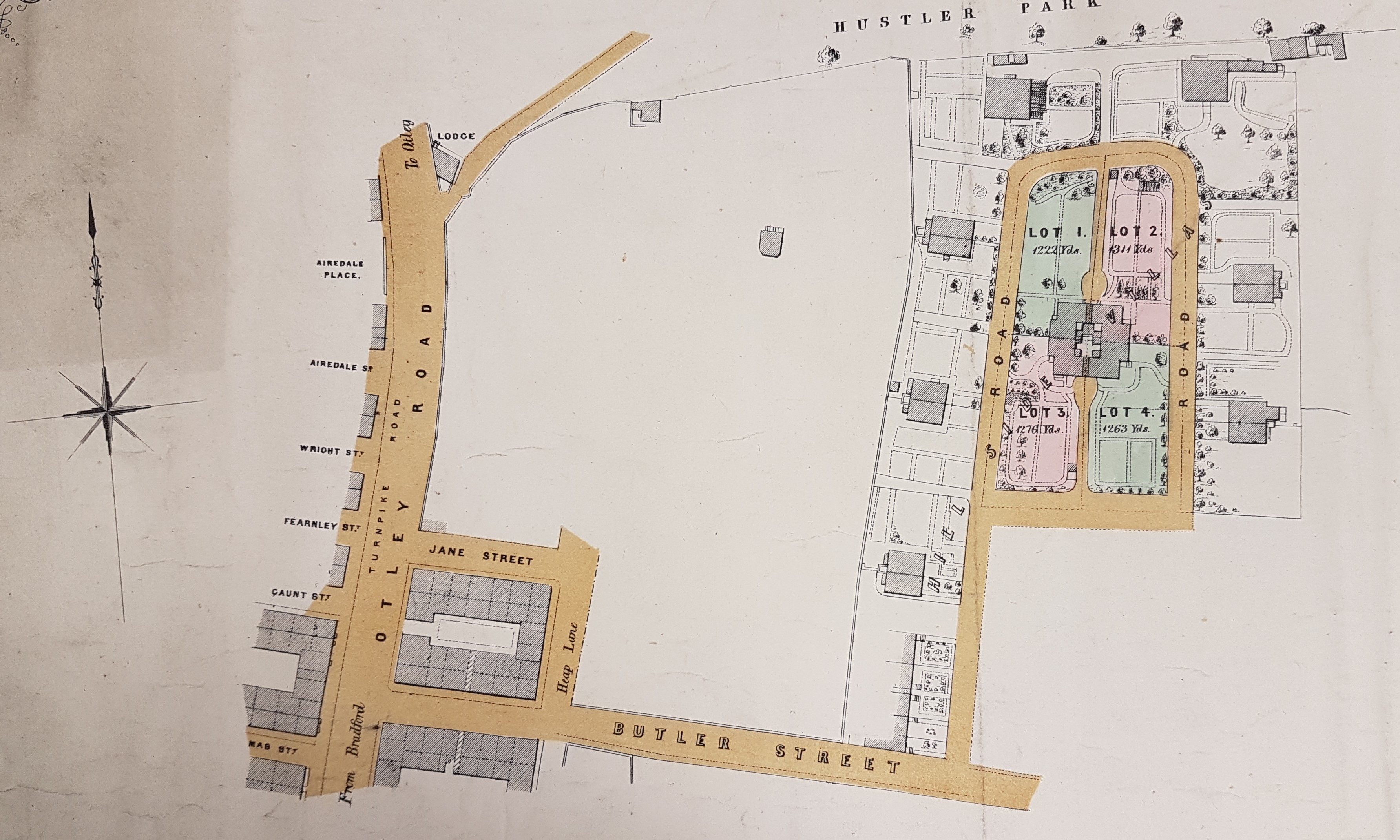 There is another clue to the date in the plan itself. It would appear that Lots 1-4 surround a central house, then there is a perimeter road, and finally outside this are seven villas that are not for sale. This is exactly the arrangement portrayed in the first Ordnance Survey map of the area (which was surveyed in the years 1847-50), and also the Bradford plan of 1849. On the OS map the area is called ‘Hillside Villas’. Surprisingly perhaps this arrangement is essentially preserved nearly 50 years later in the second OS map. The four central lots are still undeveloped, although the area to their south, adjoining the continuation of Butler Street (which links Otley Road to Barkerend Road), is filled with terraced housing. Astonishingly the same arrangement remained until my OS maps run out in 1938, although it has clearly been subject to wholesale post-War redevelopment. The name ‘Hillside’ has been preserved in several modern buildings.