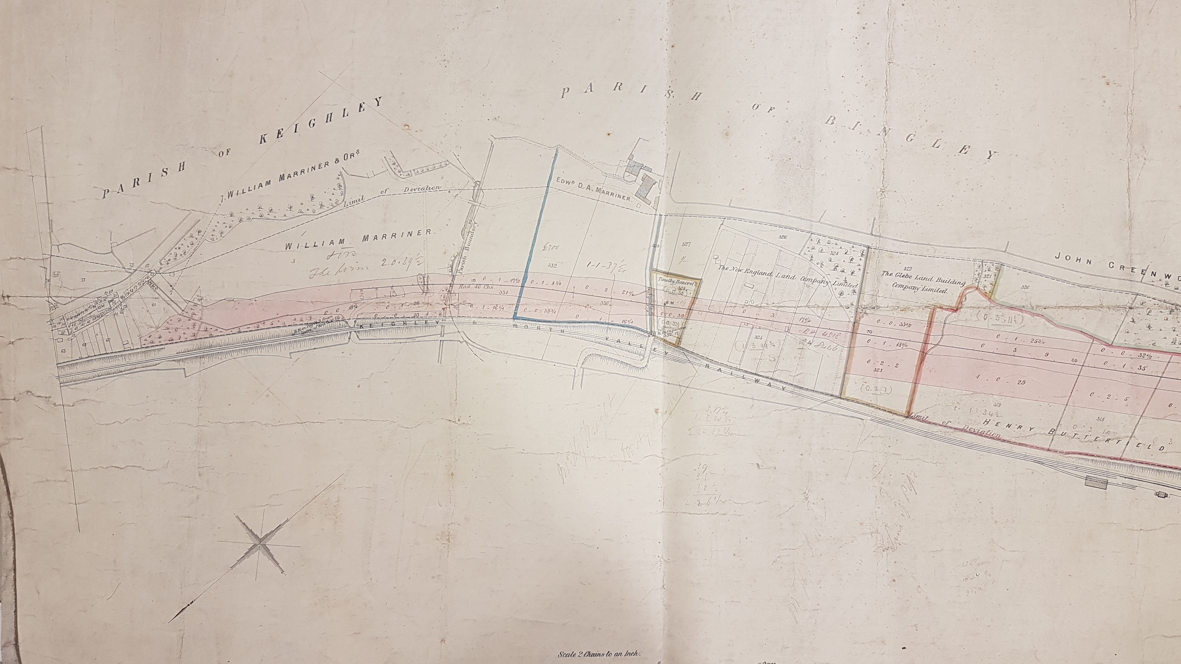 This plan’s full title is ‘Halifax, Thornton & Keighley Railway No.1: Line at Ingrow, Keighley’. There are several other copies of plans for this line in the Bradford Local Studies Library reserve collection. The railway line involved is not the mainline from Shipley via Keighley to Settle, but shows the other two lines that reached the town. As far as I know the Keighley and Worth Valley Railway was opened in 1867. The Act establishing the Halifax, Thornton & Keighley Railway company was passed in 1873, and its line to Keighley finally opened about a decade later, in 1884.
