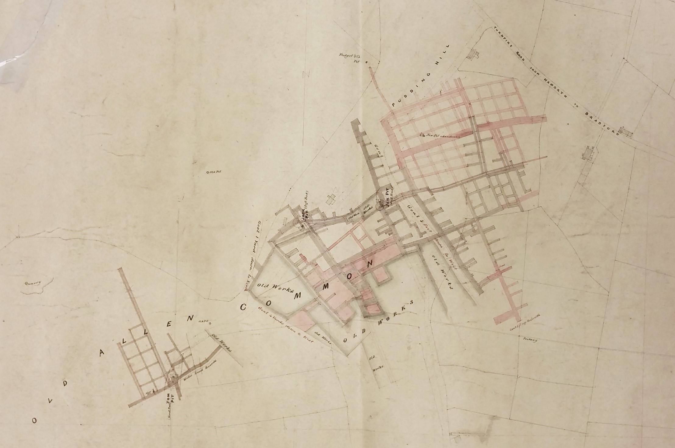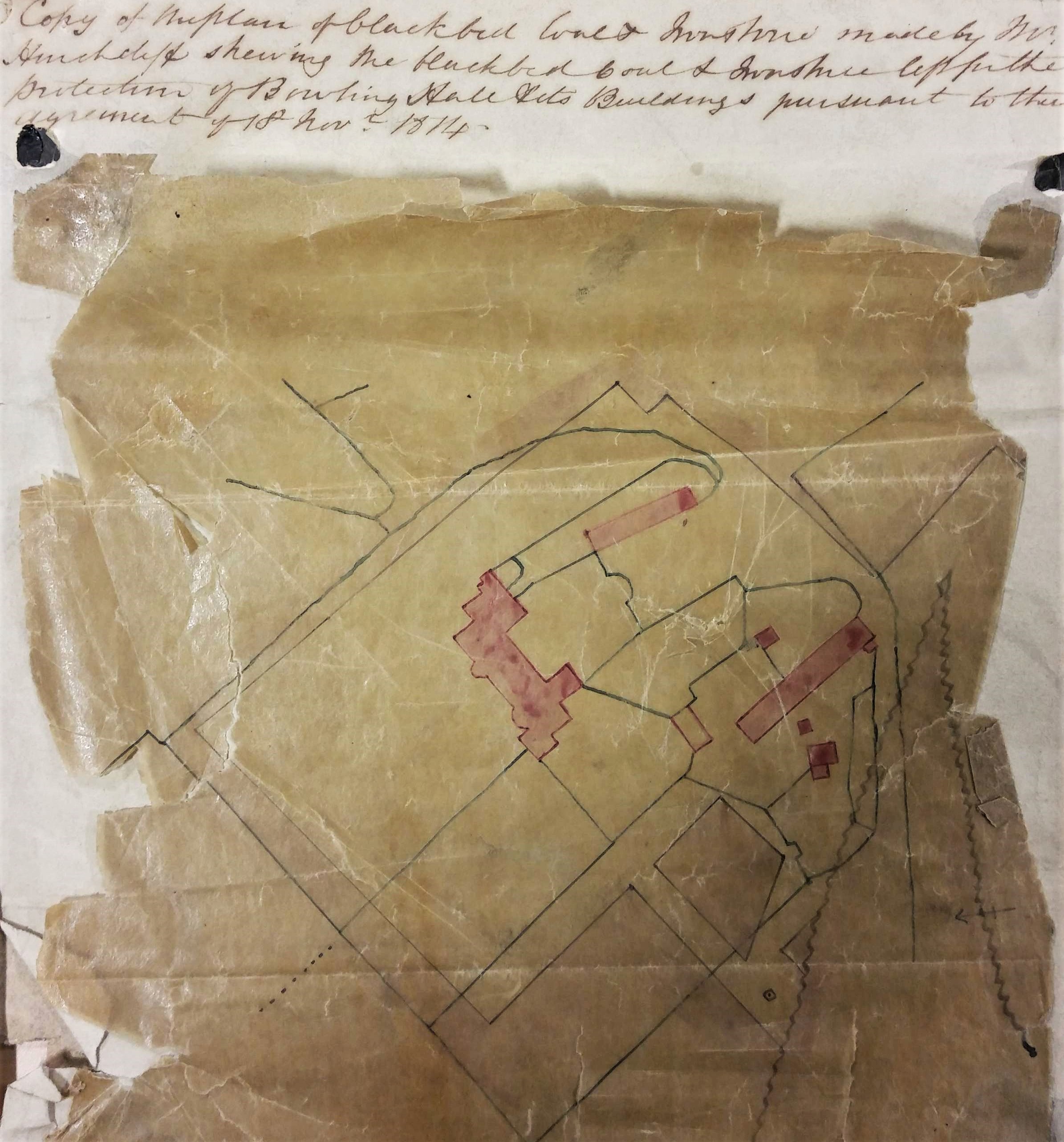 Victorian hand-writing is not always easy to read but, with small adjustments to spelling and capitalisation, the first plan is headed: ‘Copy of the plan of Black Bed coal and ironstone made by Mr Hinchcliffe showing the Black Bed coal left for the protection of Bolling Hall and its buildings pursuant to the agreement of 18th November 1814‘. In this fragile plan pink blocks represent Bolling Hall and its out-buildings. Many of the black lines are property and field boundaries. This whole central area is slightly paler in colour than the region outside the precinct boundary, which is darker and I assume represents winnable coal. The wavy line, in an inverted V shape to the right, is a geological fault. In his description of the area historian William Cudworth reported a Bolling Hall fault which threw minerals ‘down 28 yards to the south’. The coal mining concession was held by the Bowling Iron Company from the landowner, Sir Francis Lindley Wood. BIC had been established in 1780. It smelted iron ore found in the roof of the Black Bed coal seam, both of these minerals being mentioned in the plan rubric. A deeper coal seam, the Better Bed, made sulphur and phosphorous-free coke, which was ideal for iron smelting. This seam is not mentioned on this plan, nor is the shallower Crow Coal. The removal of the Black Bed and its ironstone naturally left a gap into which the overburden of rock could collapse, resulting in surface subsidence. The common practice was to leave pillars of minerals unmined to support the roof. Under especially sensitive areas, which included churches and the mine-owner’s house, no mining at all took place. To indicate such restraint must be the purpose of this plan which is now transferred to the WYA.