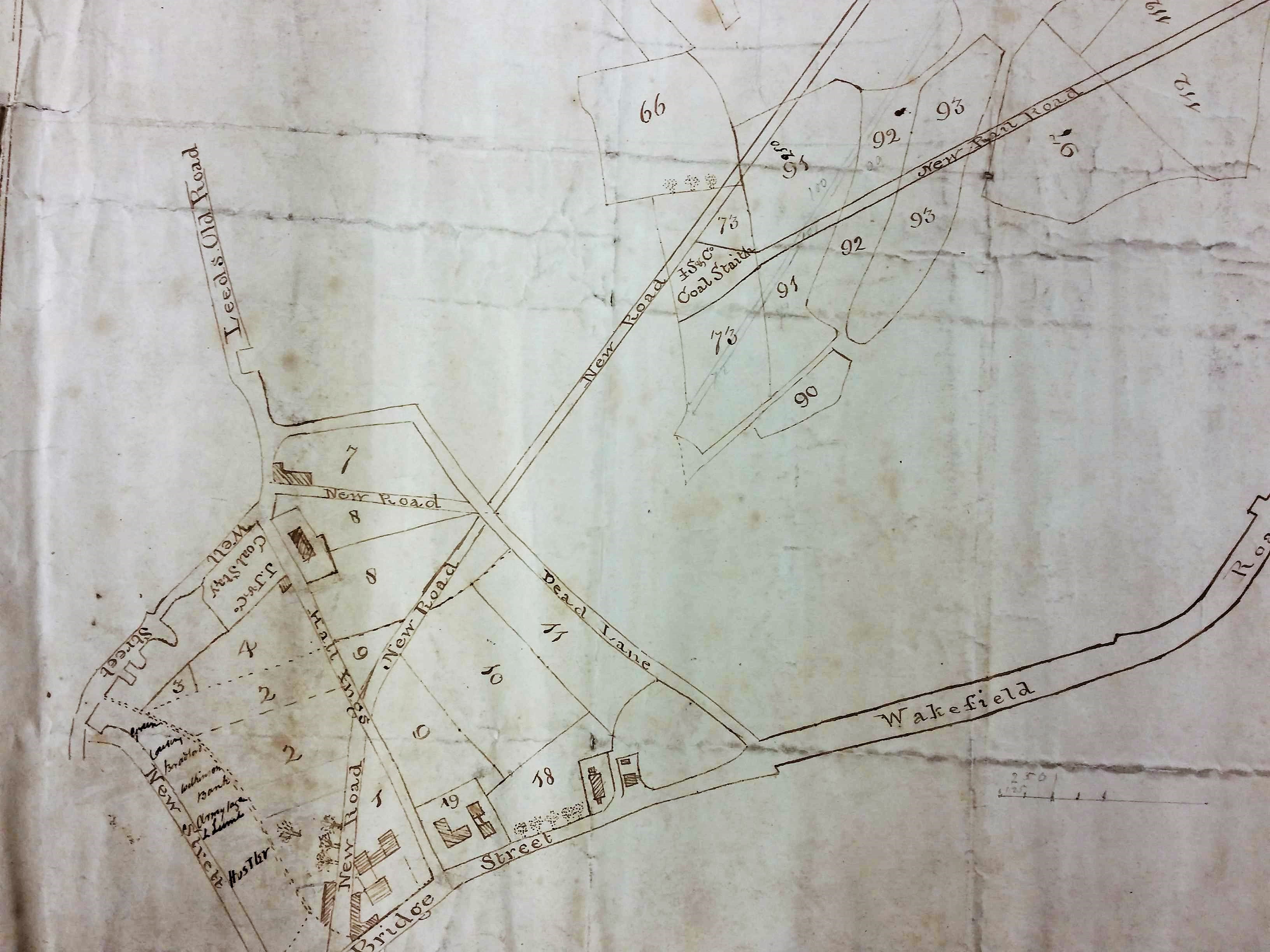 The pattern created by the ‘new roads’ portrayed on the second map exist on the Bradford plan of 1830, so we are probably looking at a map from the late 1820s. A coal staithe is a place adjacent to a highway from which merchants can collect a supply for subsequent delivery to their customers. The obvious staithe here is marked J.S. & Co. Clearly this represents John Sturges (or Sturgess) & Co. which was the company that operated Bowling Iron Works. The ‘new rail road’ drawn is in fact a mineral carrying tramway bringing coal in trucks to the Eastbrook staithe, by rope haulage, from the iron works. Bowling Iron Company owned and operated many collieries and ironstone mines. The trucks may have been returned filled with limestone, needed for iron smelting, which would have arrived at the nearby canal basin from the quarries at Skipton. The tramway was closed in 1846 and the area is marked as an ‘old staithe’ in the first OS map of the area. The is a second staithe on this map which in turn was operated by the Low Moor Iron company: can you locate it?