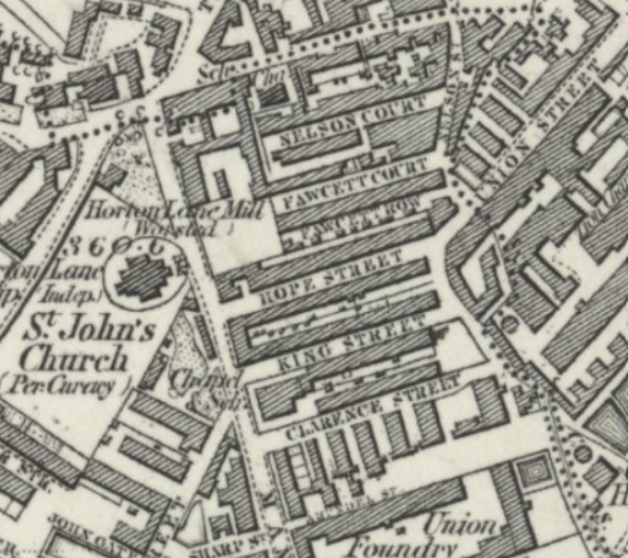 Who lived in Hope Street in the mid-nineteenth century? It features in both the 1850 Ibbotson’s and the 1856 Lund’s Directories. Neither identify a Hope Inn by that name, but in 1856 there is a John Pickard at 2 Hope Street who is a beer retailer. His house number would seem to fit with the inn location. In 1850 Joseph Pollard, a boot and shoe maker, lived at number 6 and James Forrest, butcher, at number 12. No all the trades of occupants are recorded but there is also a leather cutter, and Graham Thomas, a brazier and tinplate worker, who lived at 29. Joseph Beetham, the clerk of nearby St John’s Church also lived in Hope Street, at number 70. It is obvious that none of these house numbers feature in our plan and, in the limited time available I can’t find any of the occupants identified in the directories making returns in the 1851 census. Perhaps having moved to Hope Street you hoped to get out as soon as possible.