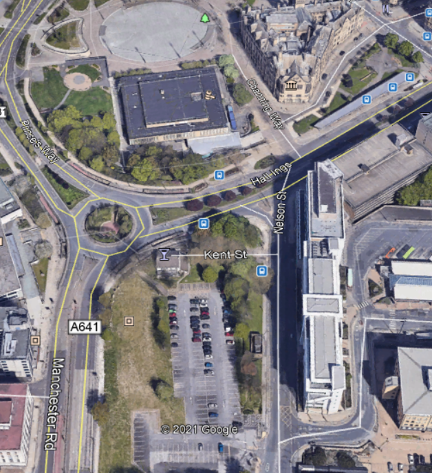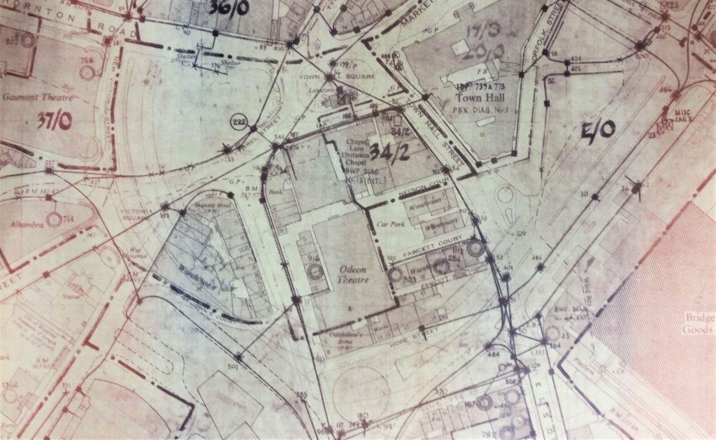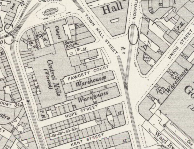 The second plan is from 1957. The LSL has a collection of plans drawn up when Bradford’s road system was being radically reorganised. You can just make out a shadowy Hope Street which confirms the position which I proposed. Please note that the Odeon Theatre just above it is not the present Odeon. This latter building is included on the plan but was then called the Gaumont Theatre.